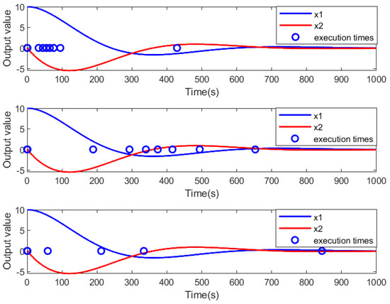 Next, we compare the event-triggering schemes in [17,22]. In Figure 5, the first figure shows the event-triggering scheme method in [17], the second figure shows the event-triggering scheme method in [22], and the third figure shows the event-triggering scheme of (9) and Remark 1. It is obvious from the figures that, for the same system, the selection of the event-triggering parameter proposed in this paper allows for a reduction in the number of event occurrences. Compared with the event triggering scheme proposed in [17], the number of triggers is reduced by 38%. Compared with the event triggering scheme proposed in [22], the number of triggers is reduced by 25%, greatly saving communication and computing resources.