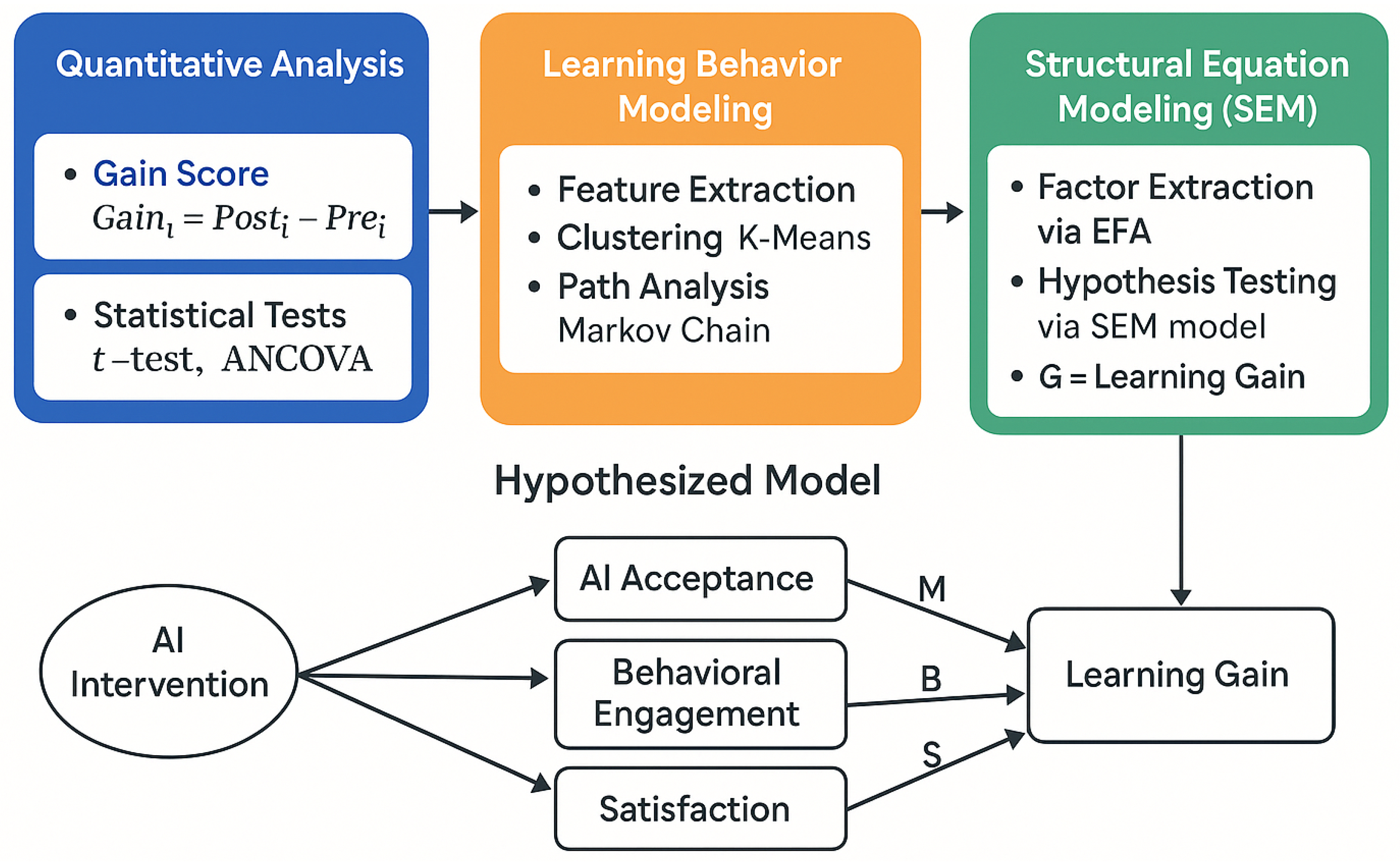 To evaluate the effectiveness of Generative-AI-assisted instruction, this study employed a mixed-methods approach that integrated statistical inference, behavioral modeling, and structural modeling.