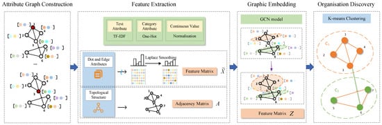The findings of many papers show that the ‘topology’ and ‘feature information’ of attribute graphs often provide complementary information, and that fusion of the two can improve the quality of feature representation. For example, feature information may help to solve the problem of missing or noisy attributes, while topology information can compensate for the structural sparsity of the network. Therefore, we need to extract features separately for attribute features and topology for subsequent feature embedding and representation. In order to accurately characterize the nodes and edges in a network, their attributes need to be refined. In this paper, three main feature processing methods are used: the TF-IDF, the One-Hot encoding, and the Normalization approach for textual, categorical, and continuous numerical attributes.