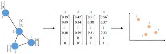 where denotes the node identity matrix of the layer, is the weight matrix of the layer, and is the activation function. Through layer-by-layer aggregation, GCN is able to learn node embedding representations that contain both local graph structure and global graph information. After the multi-layer feature aggregation of the GCN model, the final generated embedding matrix contains the low-dimensional vector representation of each node in the graph. These embedding vectors reflect both the feature information of the node and the position information of the node in the graph. After embedding through the GCN graph, the feature representation is fed into the clustering algorithm to cluster out network scanning organizations, as shown in Figure 2. Notably, [1 0], [0 0], [0 1], [1 1] are the feature vectors of nodes. Node features primarily encompass textual or image features, represented in vector form, and are presented here merely as an illustrative example.