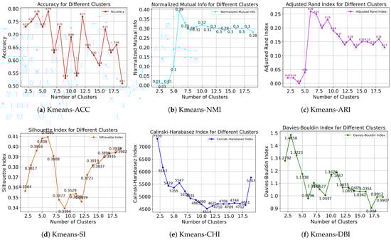 The experimental results show that the K-means algorithm has the best clustering effect, with results of 0.8341, 0.6074, 0.5652, 0.7828, 31034.5827, and 0.4235 on the six metrics ACC, NMI, ARI, SI, CHI, and DBI, respectively. Meanwhile, we can see the best experimental results after constructing the attribute graph and smoothing it with Laplace features. The worst results are obtained when features are directly spliced together without constructing an attribute graph. This does not take into account the correlations between network scanning behaviors. The experimental results after smoothing with the Laplace filter are better than the unsmoothed ones, indicating the effectiveness of the feature smoothing technique for graph feature extraction and clustering. The ACC, NMI, and ARI results of the K-means clustering algorithm for different numbers of clusters are shown in Figure 3.