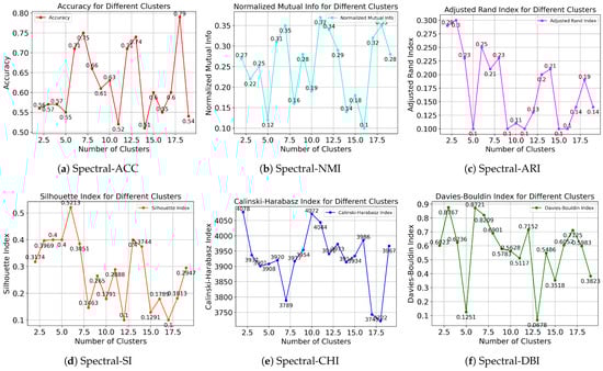 It can be seen from the figure that the ACC, NMI, ARI, and SI values of K-means clustering are maximized and the DBI value is minimized at cluster number 6, which further proves that the K-means algorithm performs optimally. The ACC, NMI, and ARI results of the Spectral clustering algorithm for different numbers of clusters are shown in Figure 4. We visualized and analyzed the clustering results as shown in Figure 5.