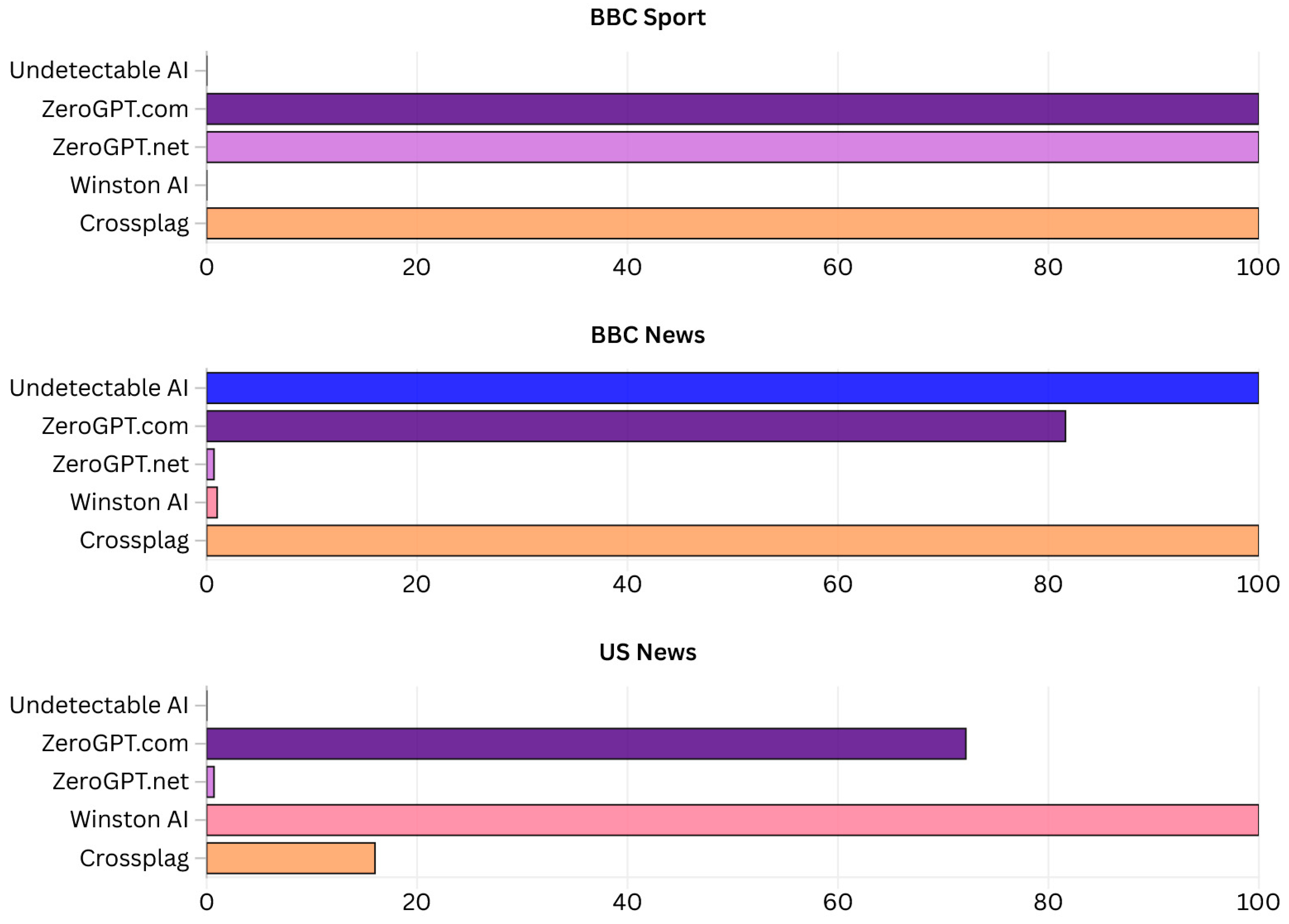 | Media Outlets | BBC Sport | 0 | 100 | 100 | “Passes as Human” | 0 | 100 | |