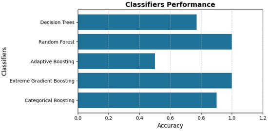 This section presents and analyzes the performance of various supervised machine learning models applied within the proposed DQMAF framework. Figure 2 illustrates the accuracy scores of all evaluated classifiers, with the x-axis representing their respective accuracy levels. Among the tested models, Random Forest, XGBoost, and CatBoost demonstrated the highest performance levels, while Decision Tree and AdaBoost exhibited comparatively lower accuracy.