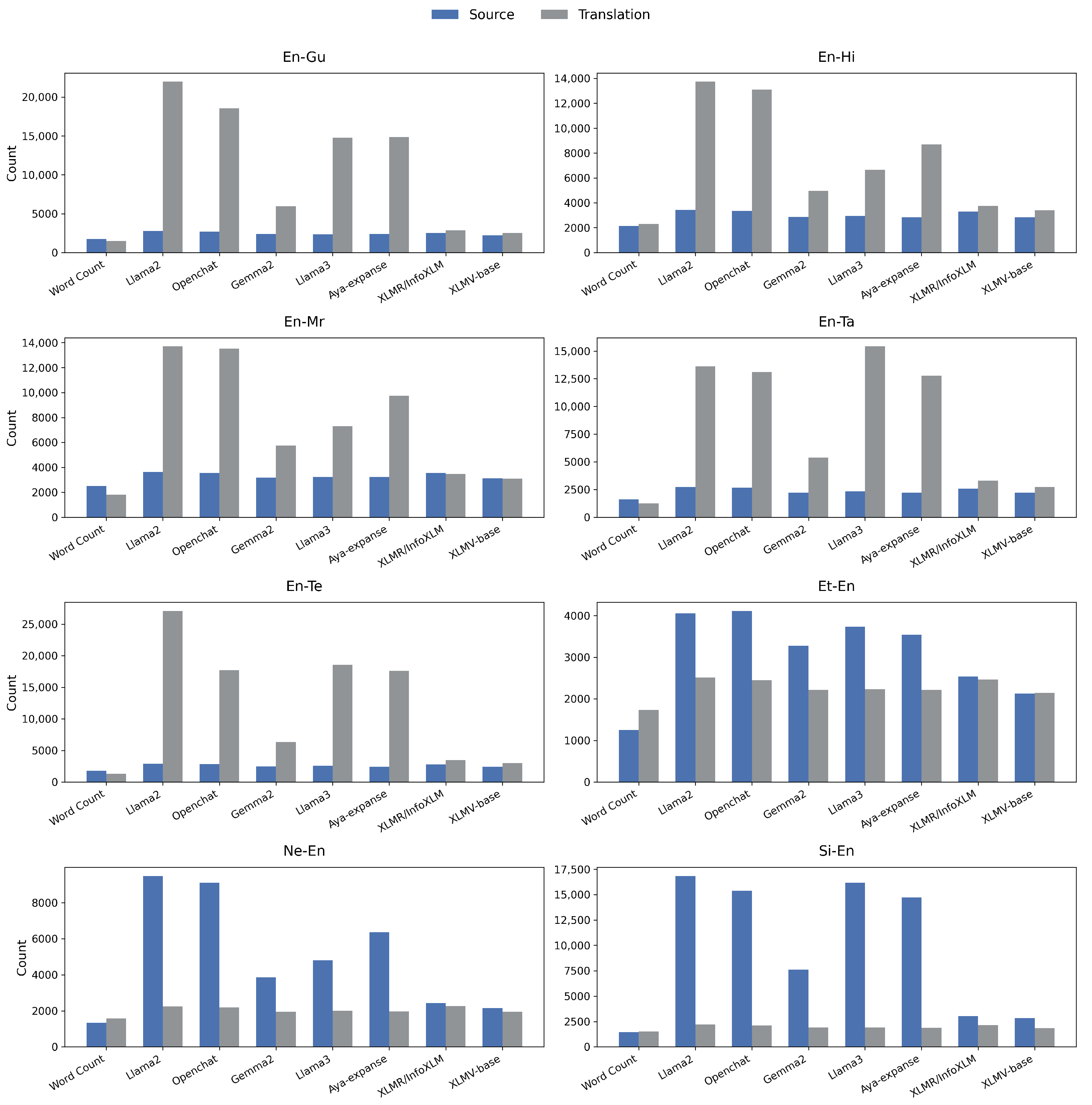 | Model | En-Gu | En-Hi | En-Mr | En-Ta | En-Te | Et-En | Ne-En | Si-En | ||||||||