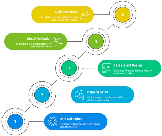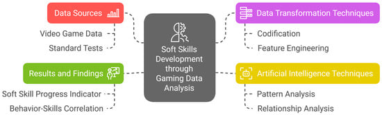 - Behavioral patterns: These are used to measure and enhance player performance by understanding their actions, strategies, and engagement levels [73,74]. This approach not only aids in improving game design and player satisfaction but also provides insights into broader social behaviors that reveal the development of soft skills, such as adaptability or leadership [75,76].