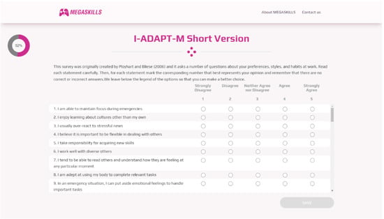 An online web platform was used and provided all the functionalities required in this phase, such as registration and identification on the platform, linking the registration with the Steam ID, integration of the standard tests (pre-test and post-test), a catalog of selected games, and details of the soft skills addressed. All the standard tests selected were digitized and integrated into the web platform. An example of one of the tests integrated on the platform is shown in Figure 3.