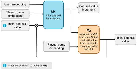 Thus, a machine learning model (M1) can be trained to receive an initial soft skill value and a set of variables that represent the playing time within a period and relate these two inputs to an output that reflects the increment in the soft skill value. However, if the model is intended to take the place of the tests, the variables related to the soft skill level prior to the gaming period would not be available to feed the input of the trained model, and, in fact, it would not be possible to estimate this initial level. For this reason, the model needs to be able to work without this information. To do so, two main changes are applied to the scheme above: on one hand, the initial soft skill value is allowed be 0 if unknown (normally no person would have a null soft skill, so 0 means unknown), and the model will also be trained with samples of unknown initial level; on the other hand, an additional piece of information, based on the features of the player is computed into an embedding, i.e., a way of converting different things like words or images into a list of numbers, where items with similar meanings are given similar numbers. This information is easy to obtain (provided that the player has a playing background) and gives an insight into the kind of soft skills that the player practices the most, so even if there is no soft skill information, the model has a profile of the individual and a measurement of the time played within a period.