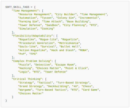 This system requires a way to compute a game embedding for each game. Analogously to the user embedding, is a 1-dimensional array with 4 elements that represent the level of soft skills provided by a game. This value is represented with a float number between 0 and 1, and it is computed considering the main tags of the game, information that is publicly available. The computation of this value is based on the 10 most relevant community-labeled tags of each game and their relevance for each soft skill based on expert knowledge. For example, co-op games are considered to be relevant to assess the cognitive flexibility of a player as they require reactivity to the actions of your teammates; similar logic can be extended to the other soft skills. Hence, given that each game in Steam comes with a set of labels that developers and even the community have designated for that game, which are known to be somehow representative of the game mechanics, storytelling, art, or mood, among others, expert knowledge can be applied to compute the percentage of the game that could be represented by each soft skill. The Steam Games Dataset (Steam Games Dataset available at: https://www.kaggle.com/datasets/fronkongames/steam-games-dataset (accessed on 15 October 2025)) data used to compute the preliminary soft skills per game provides information about more than 100 k games. Even if the dataset includes diverse information, from game descriptions to images, the most valuable data fragments for the soft skill computation task are the tags and the number of clicks the community has given to each of them. This can be considered a useful and representative way of measuring the relevance of each tag for a given game, which will be used later in this same section. For the 4 soft skills that have been tackled within this paper, the assignment of tags to soft skills is performed according to Figure 5.