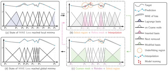 Transition a loss function from a local minimum to a global minimum. (a) Local Minimum: The MLP, based on linear layers and ReLU activations, is represented as a segmented line. Slight adjustments to this segmented line increase the area of shaded region, which represents the MAE; (b) Refinement: Detect underfitting regions of the MLP and insert midpoints to reduce the MAE; (c) Coarsening: Remove nodes with minimal impact on the MAE, decreasing the number of model parameters back to its original count. Scale up the corresponding Lagrange basis and return to Step b; (d) Global Minimum: The shaded area representing the MAE is minimized.