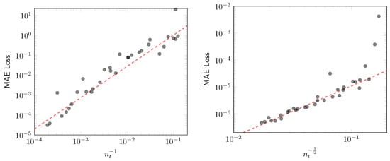 Left—Results of 32 experiments fitting the one-dimensional function , with each gray point representing an experiment. The figure shows the relationship between and test MAE loss. Right—Results of 32 experiments fitting the two-dimensional function , with each gray point representing an experiment. The figure shows the relationship between and test loss.
