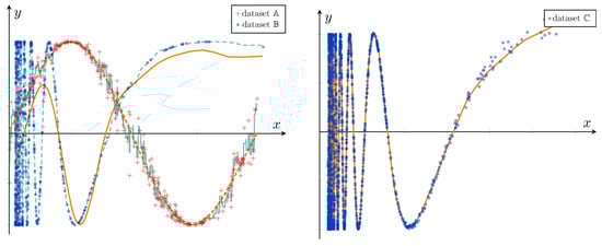 Table 1 displays the coefficient of determination () scores for the LReg and traditional regressors [9,10,11,12,13,14,15,16,17,18] across fitting the four datasets. The LReg consistently achieves high scores across all test sets, demonstrating the effectiveness of the InterpolationNet on both high-noise and multi-frequency datasets. Furthermore, the minimal gap between training and test set evaluations underscores the robustness of the LReg, indicating its capability of generalization.
