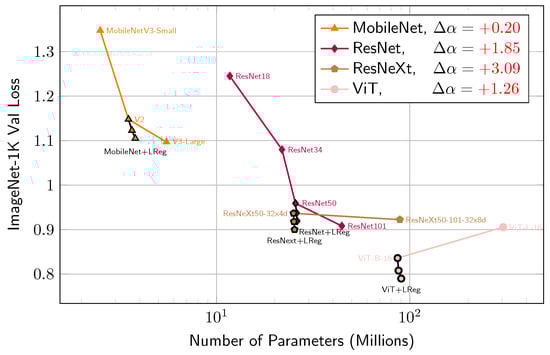 where is the cross-entropy loss on the validation dataset, and c and are constants related to the model type. Figure 5 shows that our method is more effective than simply scaling the model size. Our method increases the for MobileNet [25] from 0.27 to 0.47, for ResNet [26] from 0.25 to 2.1, for ResNeXt [27] from 0.01 to 3.1, and for ViT [28] from −0.06 to 1.2.