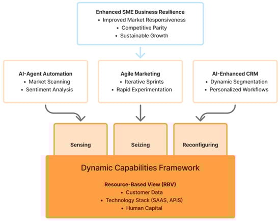 To integrate the diverse literature streams of business resilience, AI-agent automation, Agile Marketing, and CRM, we propose a conceptual framework grounded in the Resource-Based View (RBV) and the theory of Dynamic Capabilities (DC). The RBV posits that a firm’s competitive advantage is derived from its unique and valuable resources. For SMEs, these resources increasingly include not just financial capital but also customer data, technology platforms, and specialized human skills. However, in volatile markets, the mere possession of resources is insufficient for sustained resilience; firms must be able to adapt.