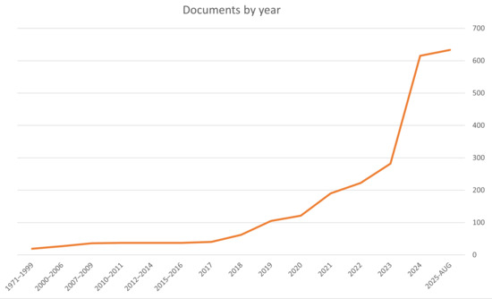 Our initial search on Scopus aimed to provide a broad overview of the research landscape surrounding the term “AI agent” or “AI-agent”. This foundational query yielded a total of 2465 documents, indicating significant and growing academic interest in the topic. The results span from 1971 to 2025, with a marked increase in recent years. The annual distribution of publications shows a particularly sharp growth from 2020 onward, with 633 documents already indexed in 2025 (up to August 7), compared to 615 in 2024 and 282 in 2023 (see Figure 2). This trend reflects the increasing adoption of AI agents across sectors and the expanding scope of research and development in this field.