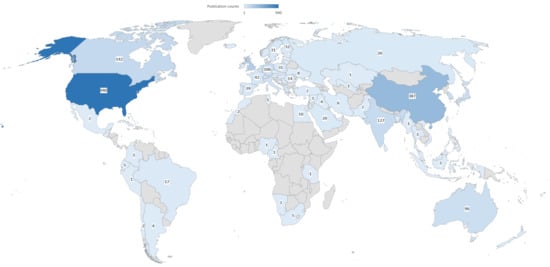 Global distribution map of country/territory contributions to AI agent research based on publication counts.