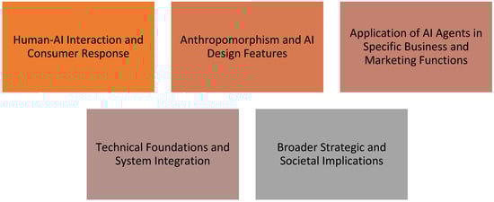 Once this final set of 44 documents was compiled, a systematic content analysis was performed to identify recurring themes and key areas of focus within the selected literature. Each abstract and, where necessary, the full text of the articles were carefully reviewed to discern their primary contribution and context. This iterative process allowed us to categorize (see Figure 5) the documents into coherent thematic clusters, which provided a structured framework for understanding the diverse roles and impacts of AI agents in commercial and consumer-facing environments. These categories were derived through qualitative coding and thematic saturation, reflecting the prevailing research directions within this specific intersection of AI and business.