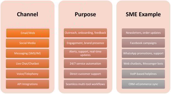 Applications for AI agents in SMEs are diverse. Chatbots can enhance supply chain sustainability and provide 24/7 customer service, addressing traditional SME limitations [39,40]. AI-driven automation simplifies CRM processes, enabling personalization and loyalty-building at scale by using machine learning to forecast customer behavior [13,41].