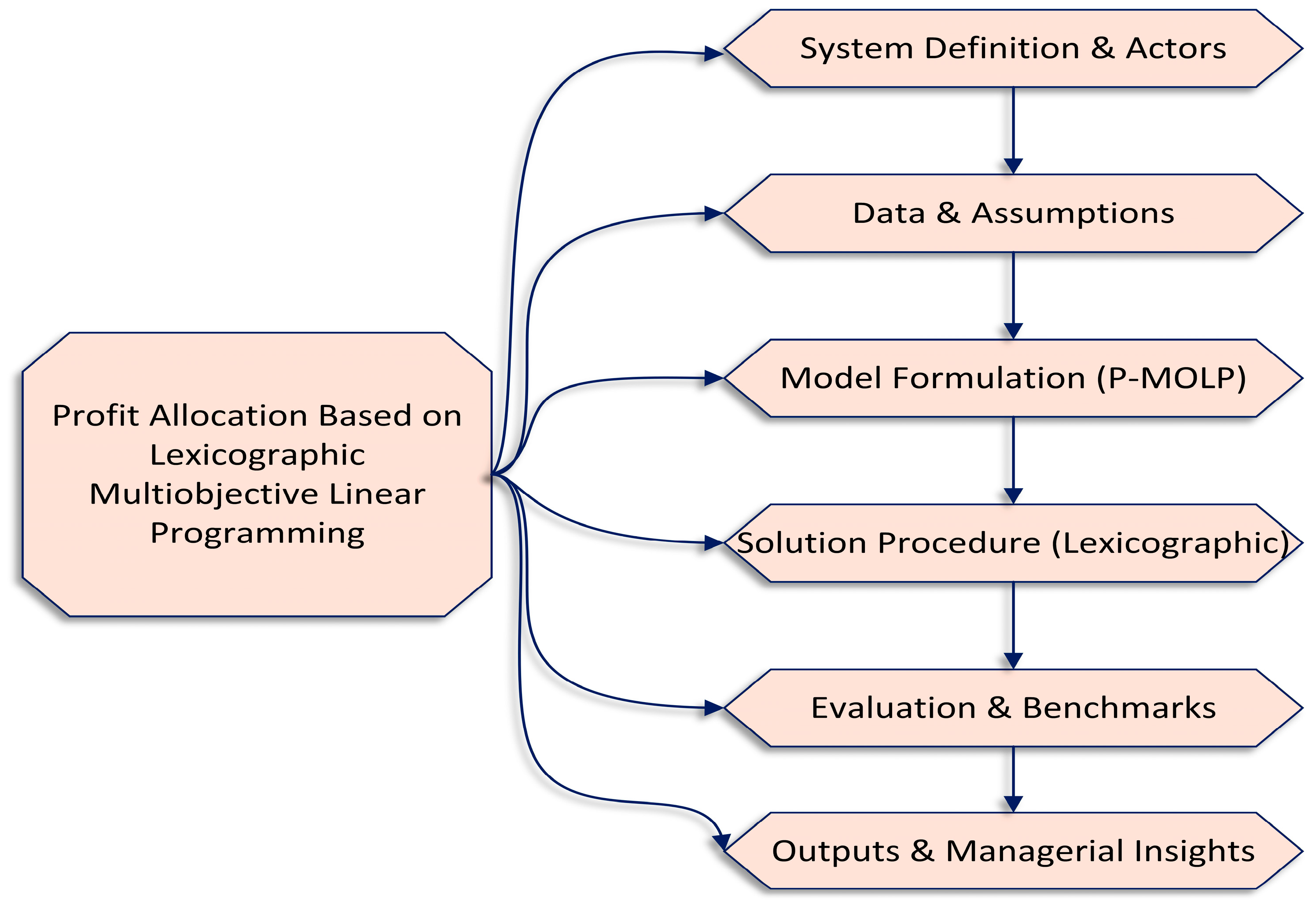 Figure 1). First, we build a contribution-evaluation index and obtain member weights via group decision-making (GDM). We then rank the candidate cooperation structures by priority based on these weights. We then adopt a priority-based multiobjective linear program in which tiered optimization satisfies high-priority goals first and refines lower-priority ones. The resulting profit-allocation model—Priority-Based Multiobjective Linear Programming (P-MOLP)—enforces individual rationality and budget balance.