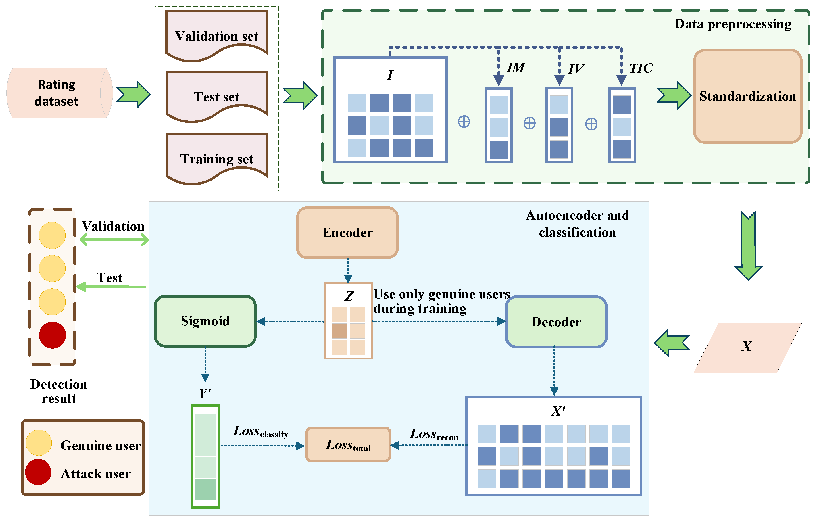 - SpDetector [27]. This method effectively captures shilling attacks by constructing multiple components such as user spectral features, item similarity offset, and rating prediction error. It then uses these carefully designed features to train a deep learning network for detection. Its representativeness lies in not solely relying on end-to-end automatic feature learning but combining domain knowledge for multi-angle feature engineering, then using a deep learning model for classification, reflecting a strategy that combines feature engineering with deep learning.