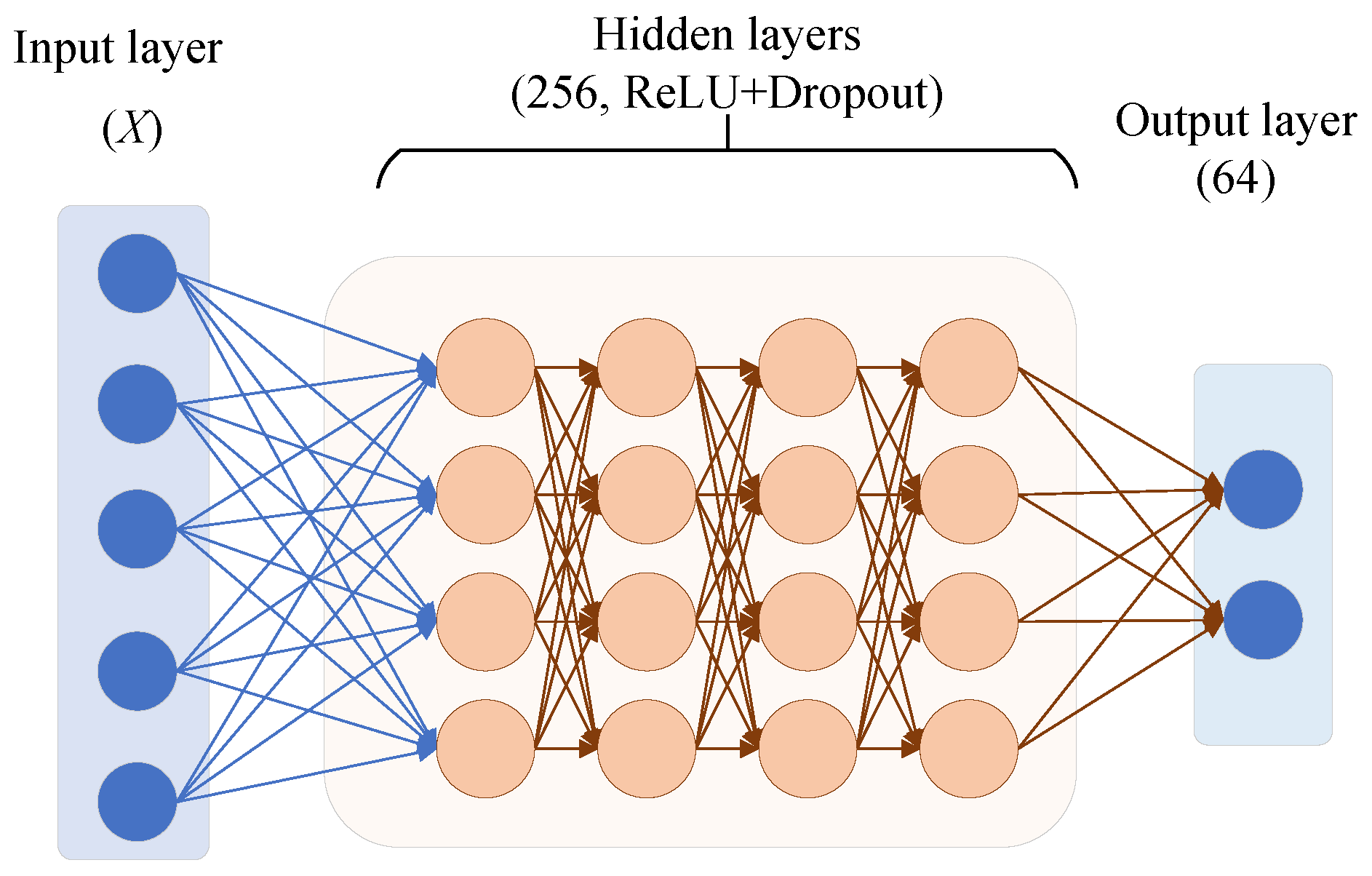 - Hidden Layers (4 layers). The encoder contains four hidden layers that progressively abstract and reduce the dimensionality of the input features. Its structure is defined as: . The uniform width facilitates capacity control and stable training. ReLU provides non-linear representation, while Dropout mitigates overfitting on sparse dimensions.