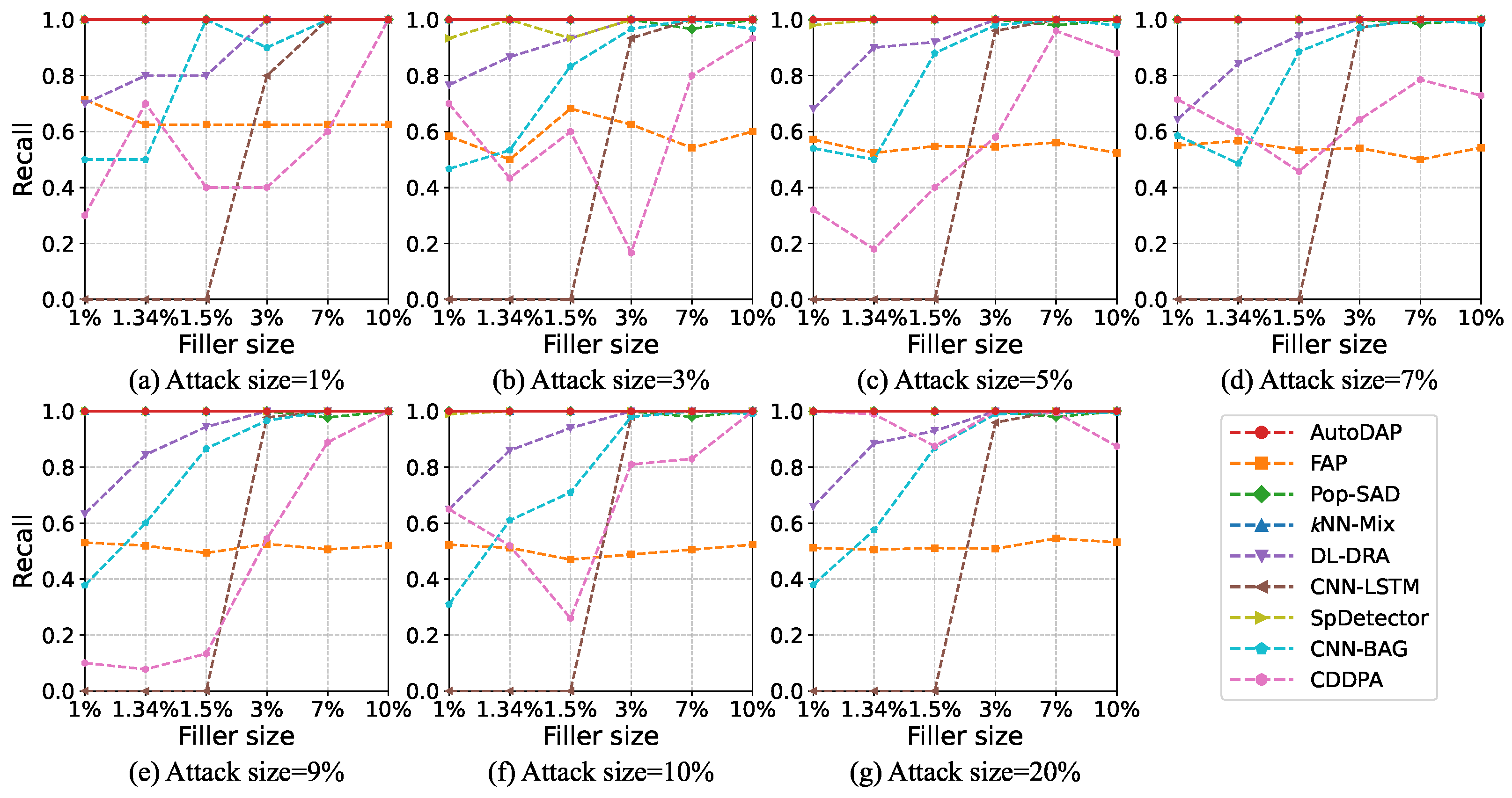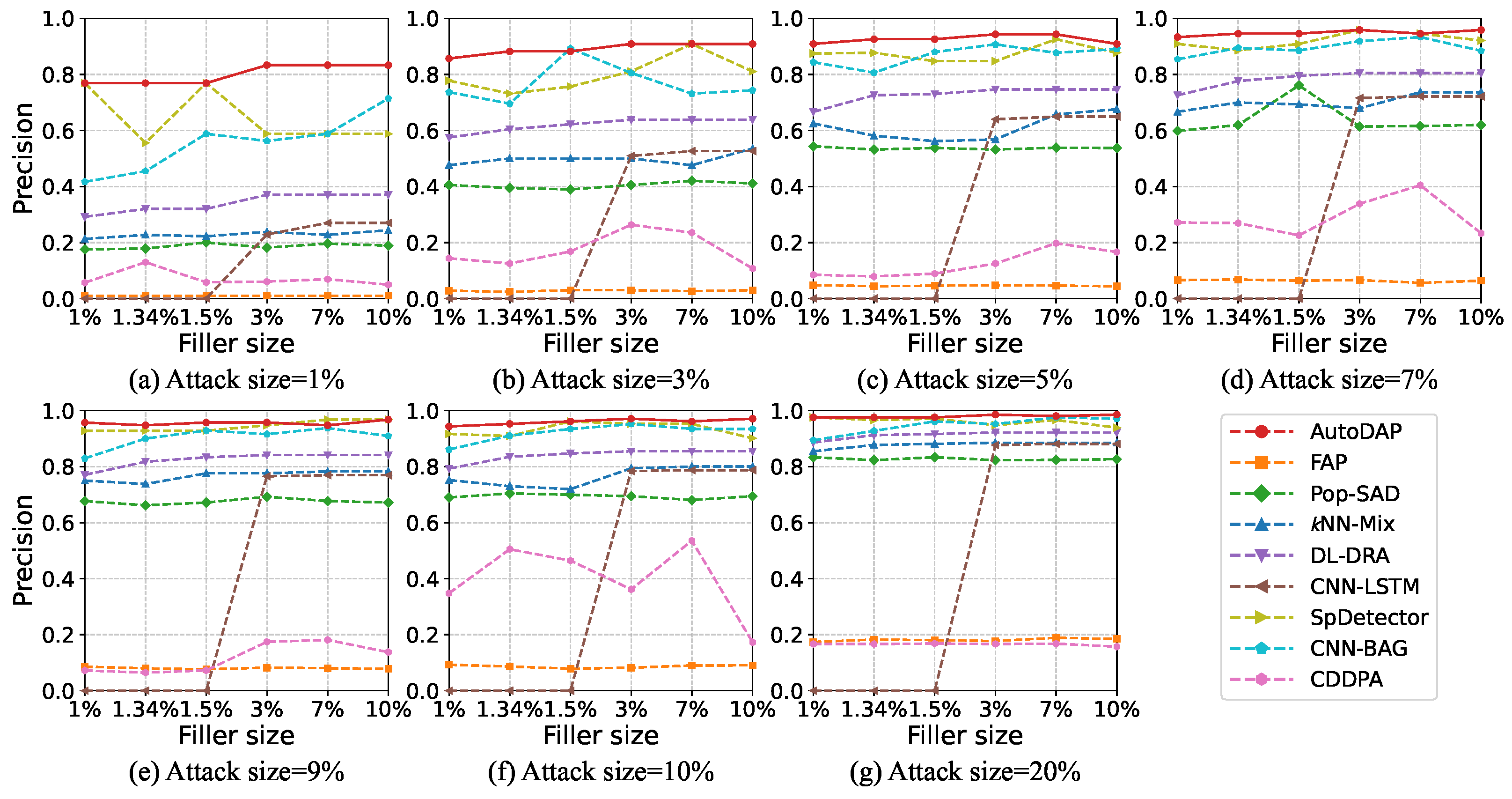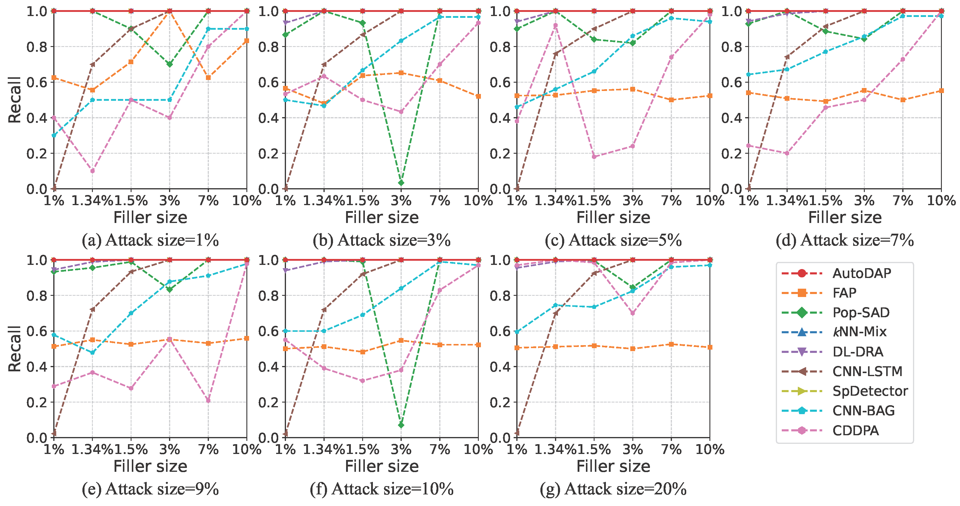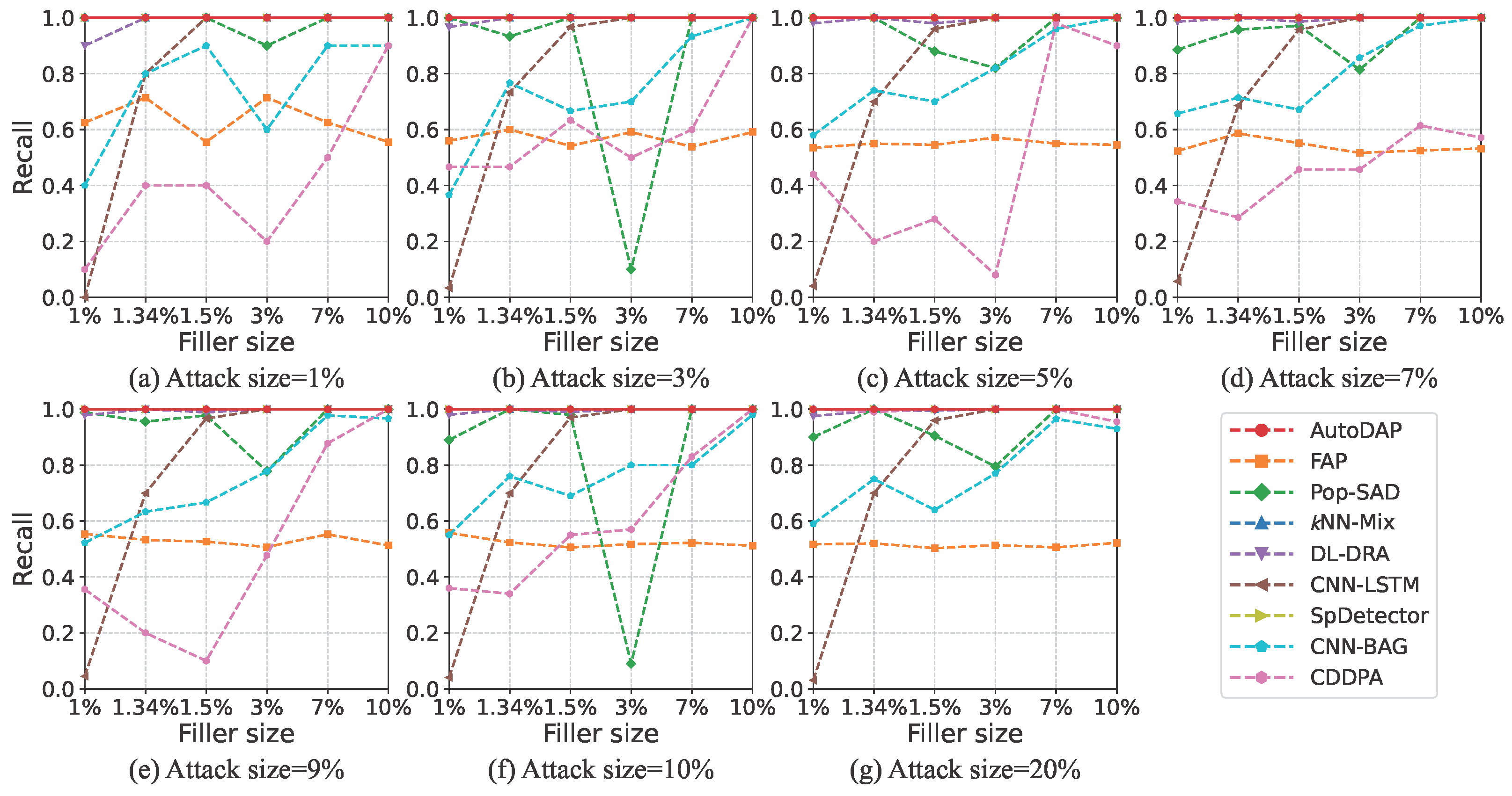 - Extensive experimental validation. Evaluations on the MovieLens-10M dataset against various poisoning attacks and on the Amazon dataset with real attack samples demonstrate AutoDAP’s superior performance. It outperforms several representative baseline methods against diverse GRS poisoning attacks, showing good effectiveness and robustness.