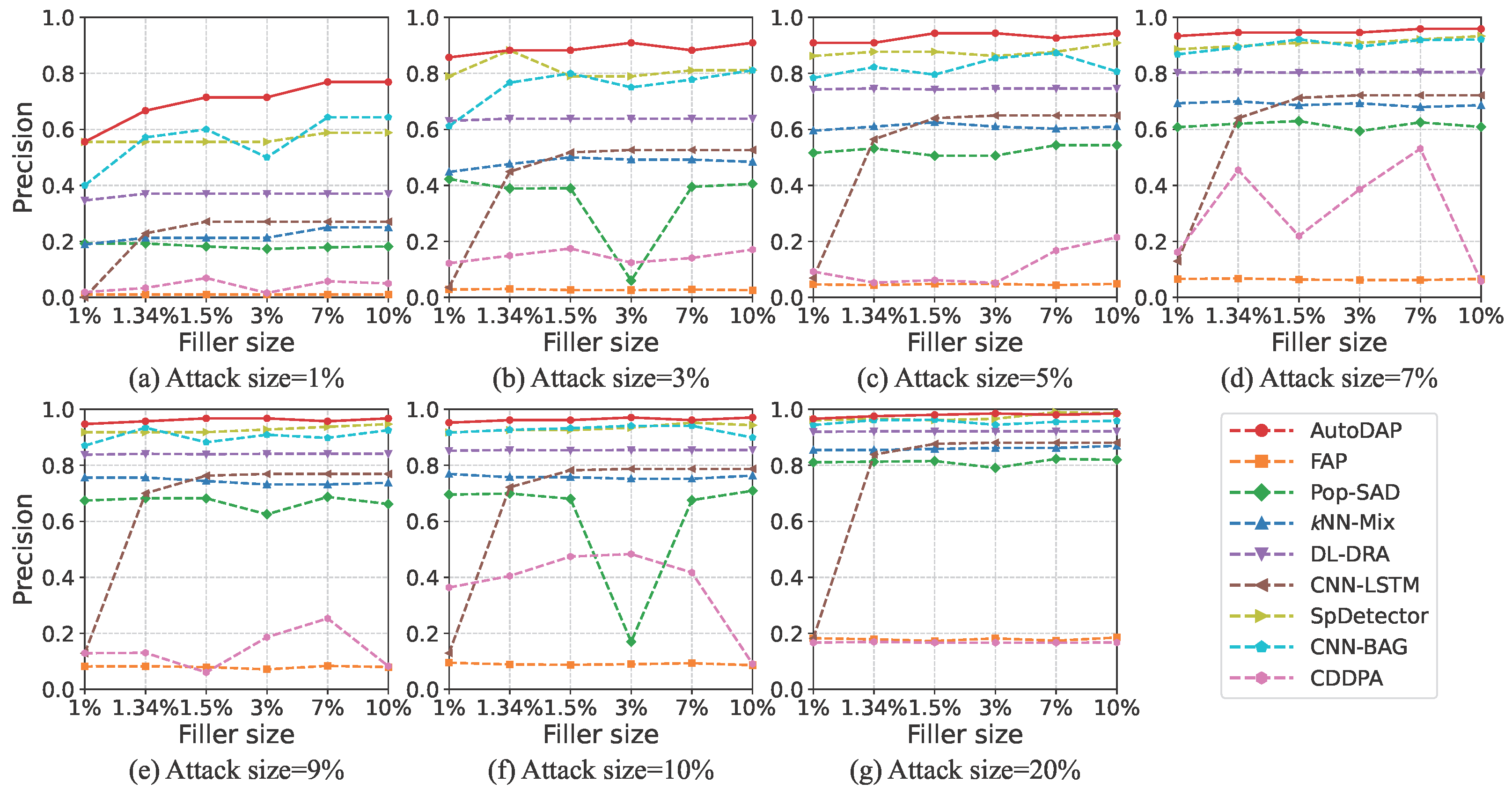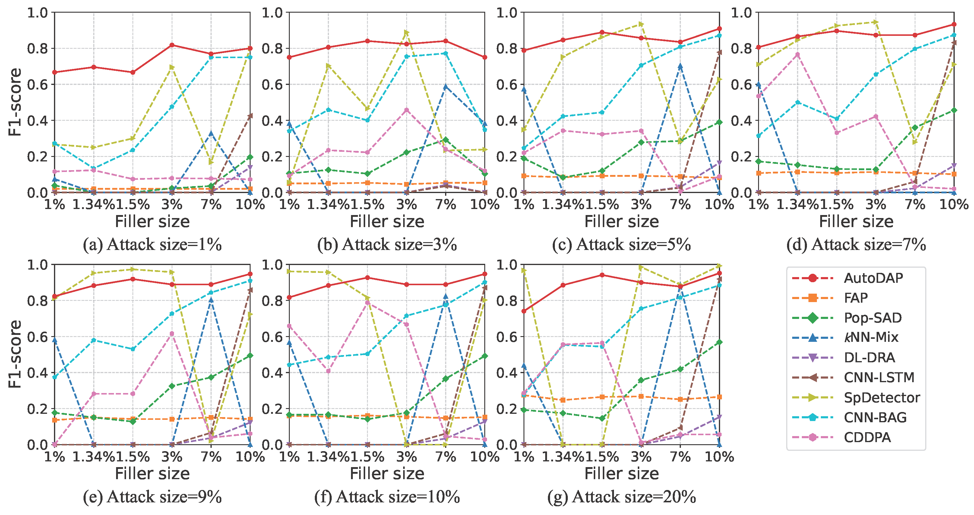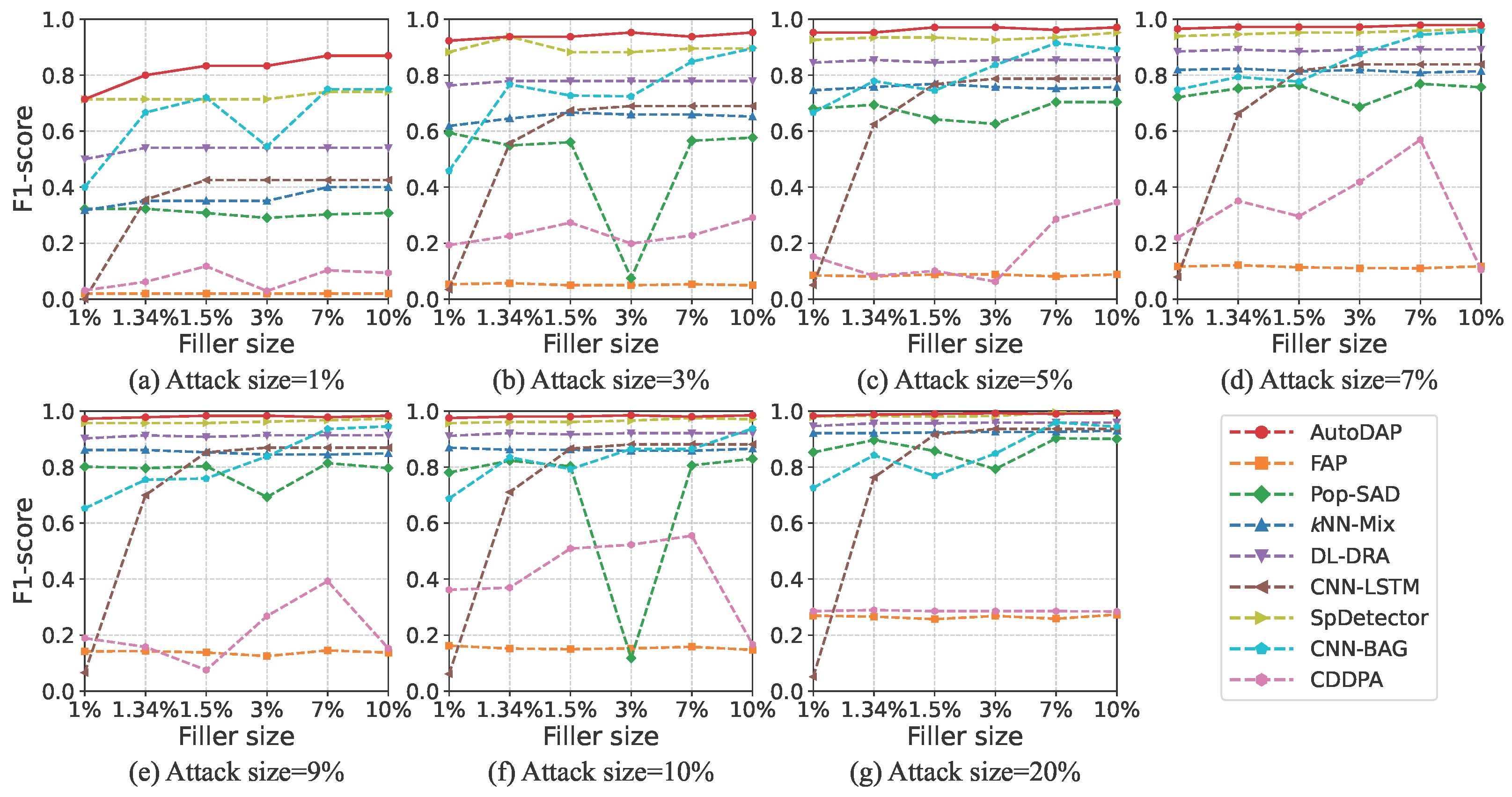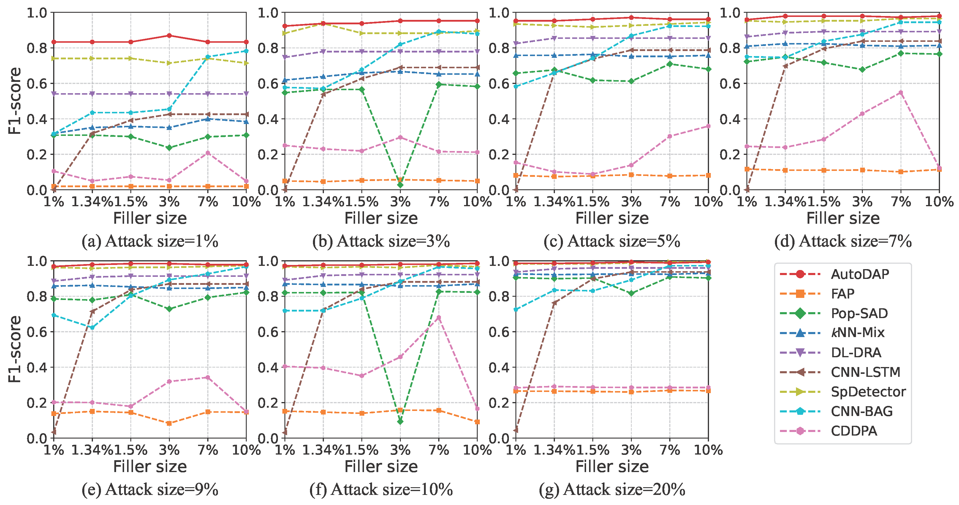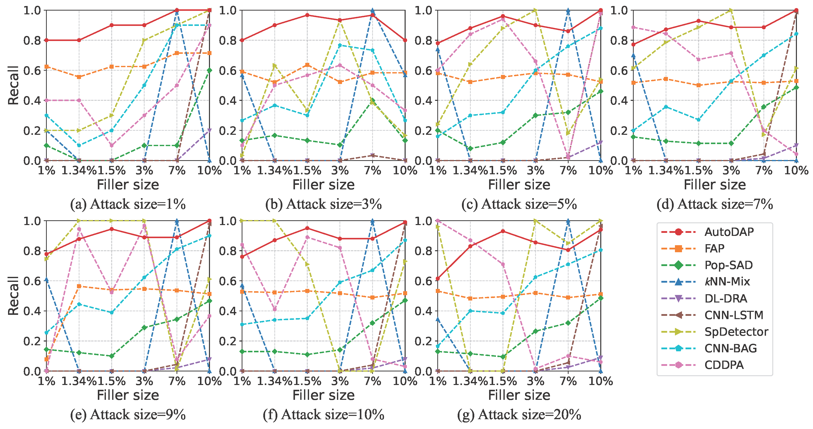 - Extensive experimental validation. Evaluations on the MovieLens-10M dataset against various poisoning attacks and on the Amazon dataset with real attack samples demonstrate AutoDAP’s superior performance. It outperforms several representative baseline methods against diverse GRS poisoning attacks, showing good effectiveness and robustness.