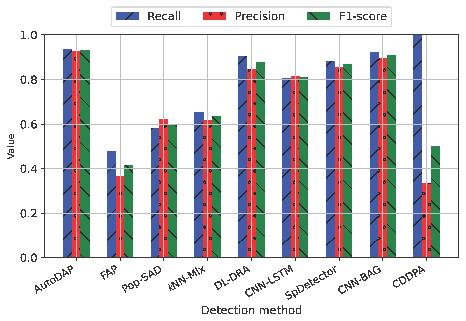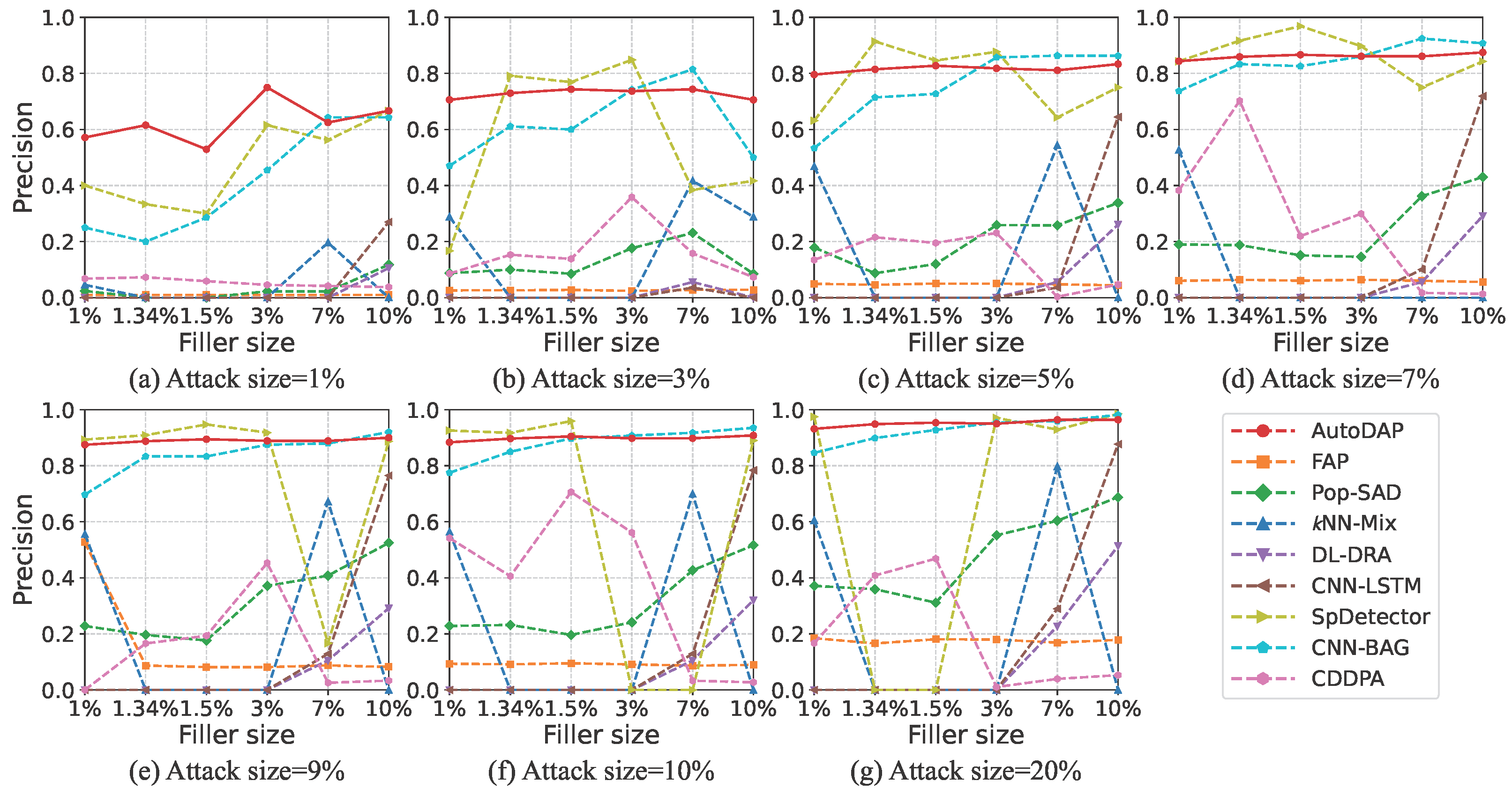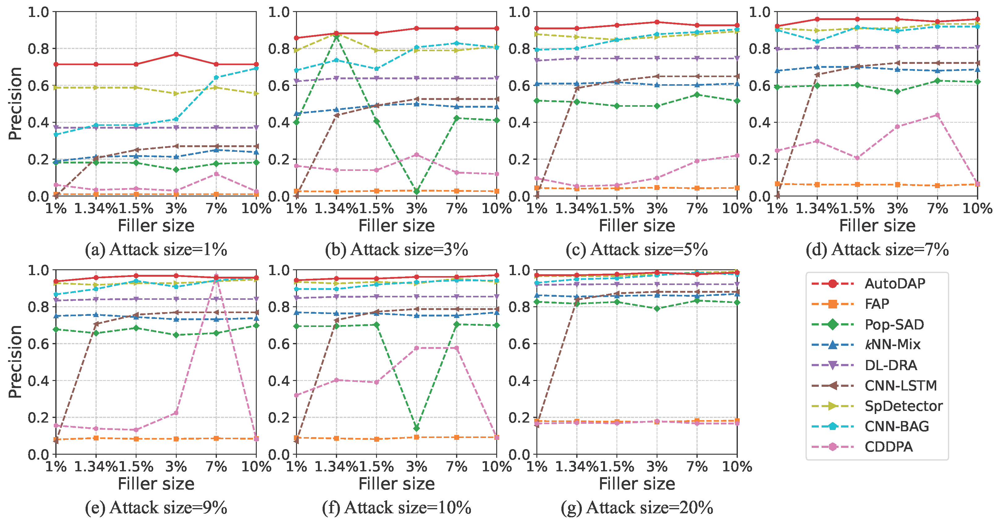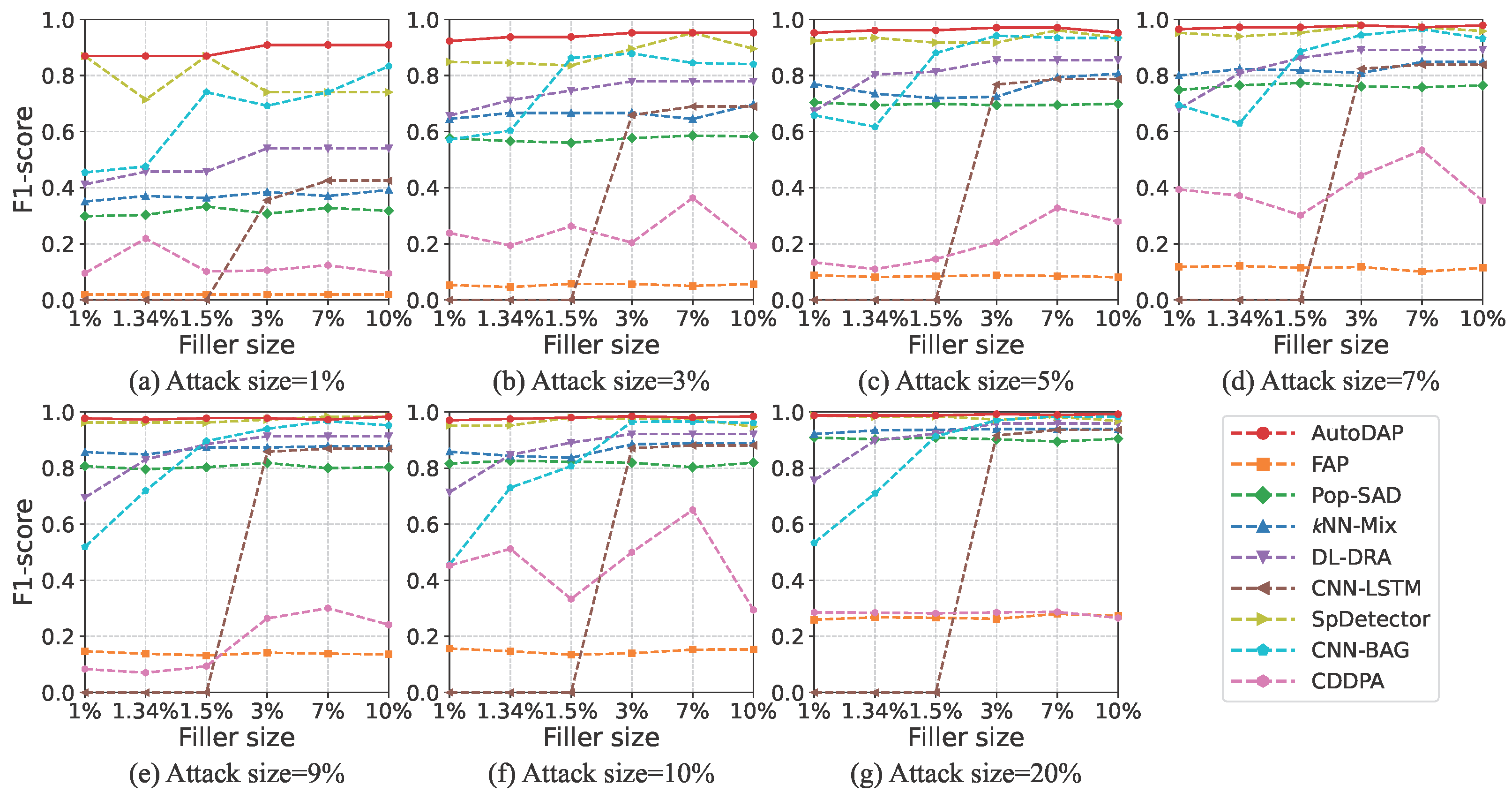 - Extensive experimental validation. Evaluations on the MovieLens-10M dataset against various poisoning attacks and on the Amazon dataset with real attack samples demonstrate AutoDAP’s superior performance. It outperforms several representative baseline methods against diverse GRS poisoning attacks, showing good effectiveness and robustness.