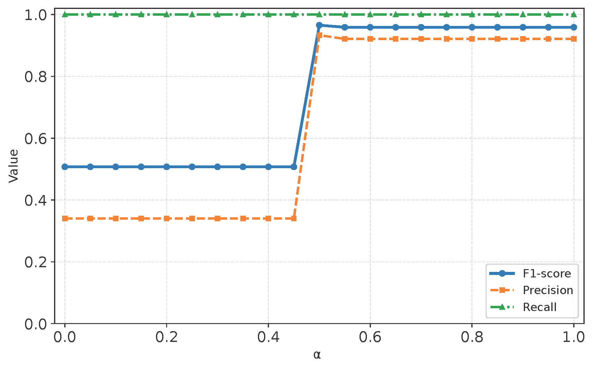 - Validation and Hyperparameter Optimization. The validation set is used to optimize key model hyperparameters, such as training epochs, loss function weighting factors, etc. The core goal is to find a set of hyperparameters that achieve the best model performance on the validation data (e.g., maximizing F1-score). Based on this, a final discrimination threshold F is determined to distinguish between attack and genuine users. The detailed calculation of this threshold F will be described in Section 3.2.5.