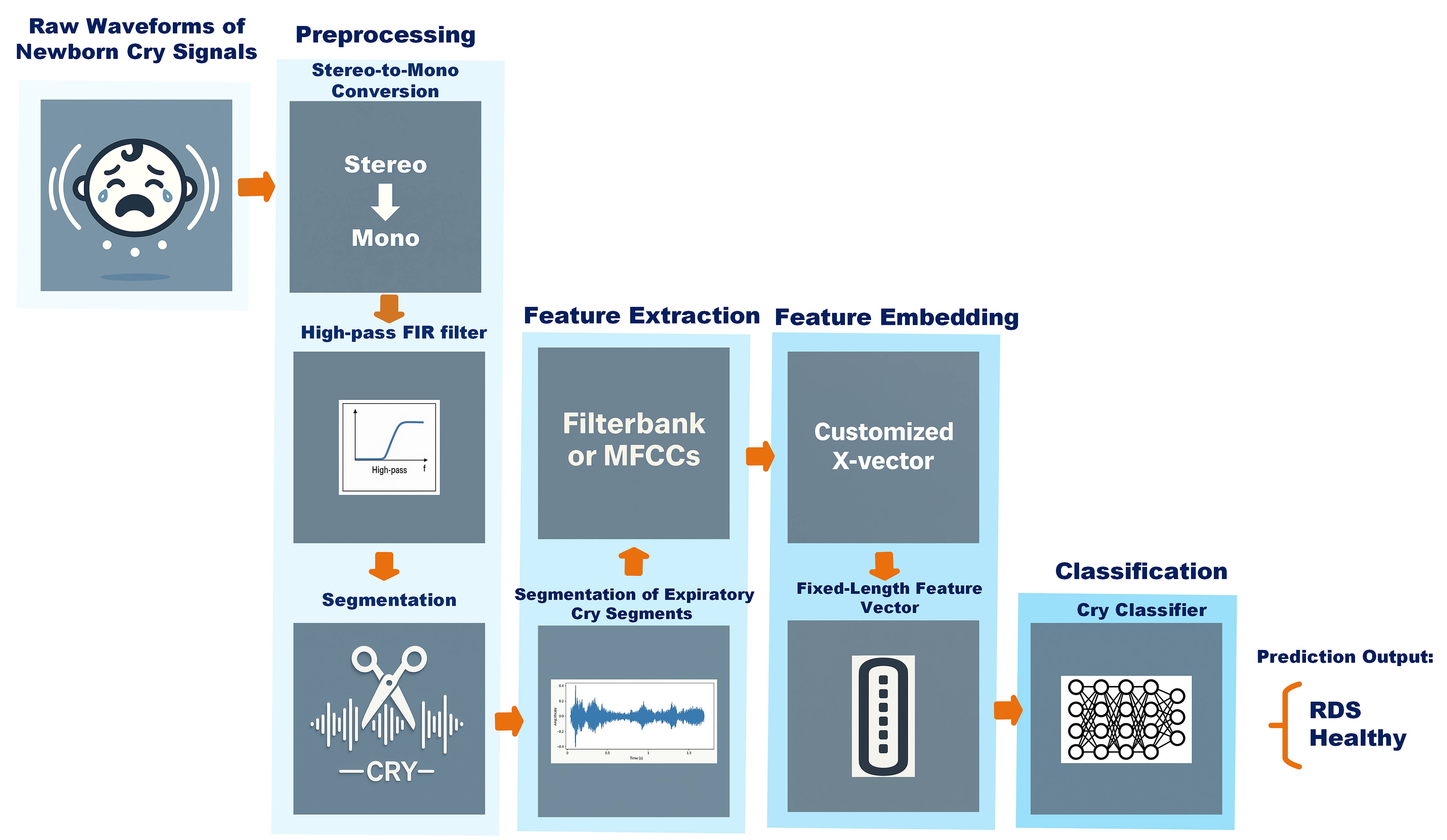- Shayegh, S.V.; Tadj, C. Deep Audio Features and Self-Supervised Learning for Early Diagnosis of Neonatal Diseases: Sepsis and Respiratory Distress Syndrome Classification from Infant Cry Signals. Electronics 2025, 14, 248. [Google Scholar] [CrossRef]