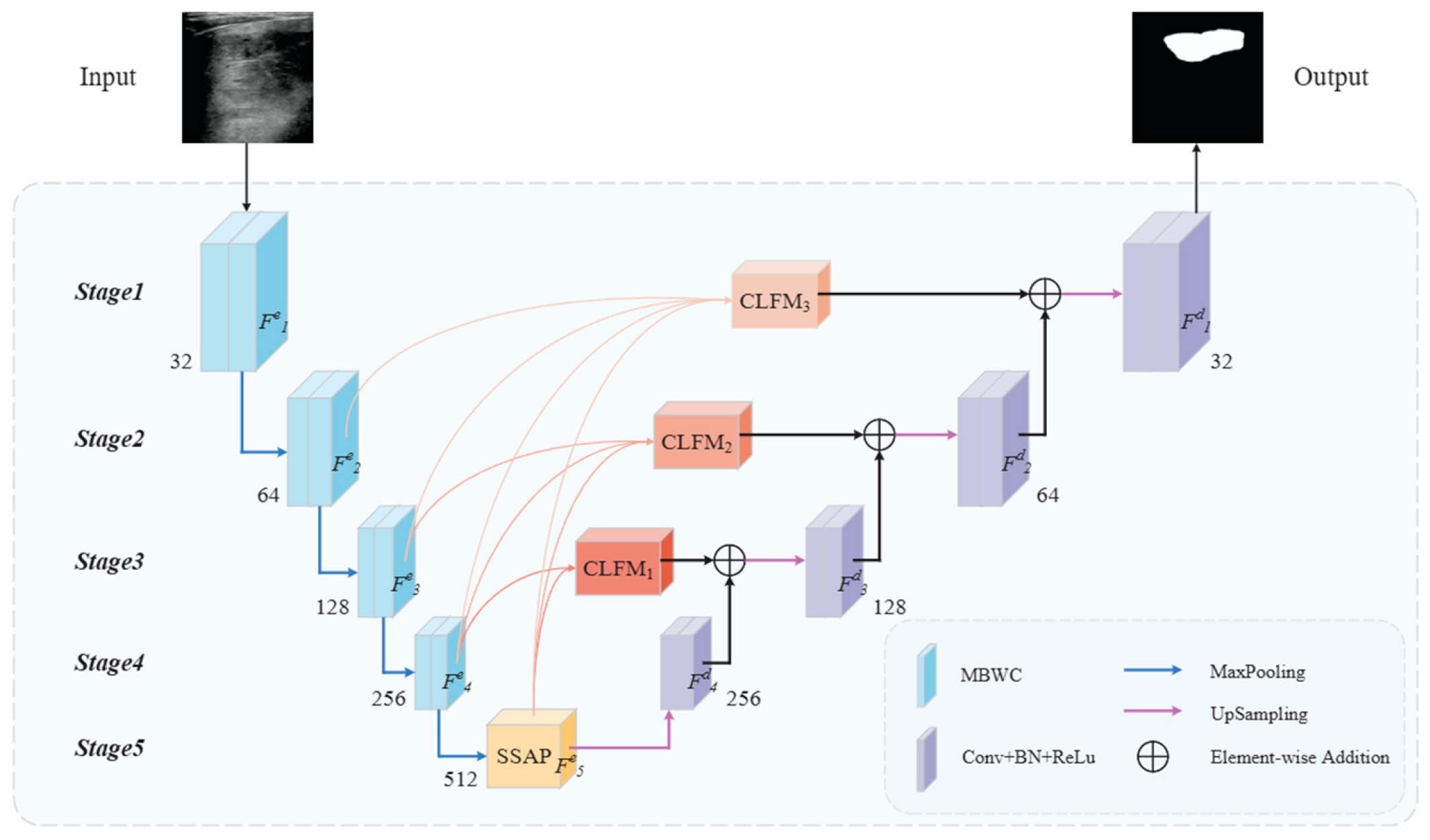 The proposed MCFU-net is a network based on an encoder–decoder architecture, and the overall framework is shown in Figure 2. Given a thyroid ultrasound image as input, the network employs MBWC blocks for downsampling in the encoding process, continuously aggregating global information. The top-level encoder uses the SSAP module to capture multi-scale semantic information from high-level abstract features, enhancing sensitivity to small nodules. Additionally, multiple CLFMs are employed to reconstruct skip connections, propagating high-level features as prior knowledge to the decoding process to guide image restoration. Ultimately, the network outputs pixel-level semantic prediction results.