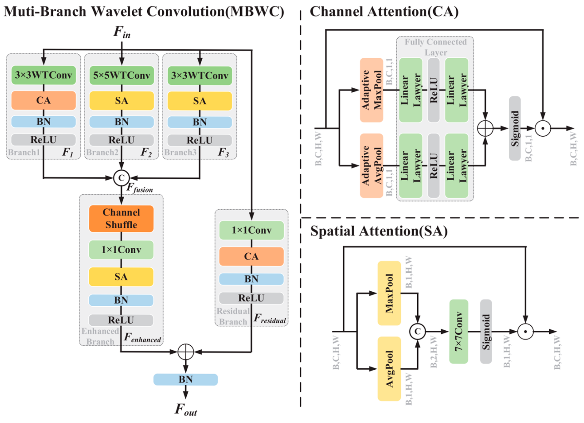 where W T C o n v 3 × 3 and W T C o n v 5 × 5 ( ) represent wavelet convolutions with kernel sizes 3 and 5 respectively. C A and S A represent the channel attention mechanism and the spatial attention mechanism respectively. B represents the batch normalization operation, and δ denotes the ReLU activation function:
