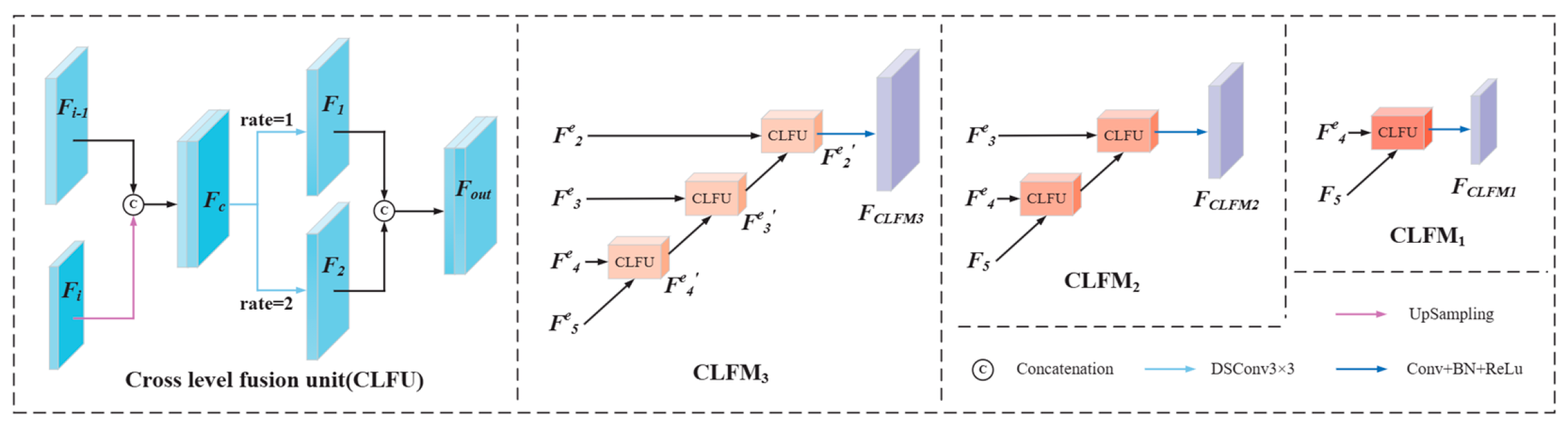 Specifically, the CLFU integrates high-level and low-level features step by step to create a richer and more semantic feature representation, thereby enhancing the ability of low-level features to represent the target area and aiding in the recovery of fine-grained information. Firstly, CLFU receives two adjacent-level features F i and F i 1 . F i 1 is mapped to the same dimensions as F i using a transposed convolution operation, and they are then concatenated to obtain F c . Secondly, two depthwise separable convolutions with dilation rates of 1 and 2 are applied to obtain two feature maps F 1 and F 2 at different scales. Finally, the output F o u t is obtained by concatenating the two feature maps. The specific computation process is as follows: