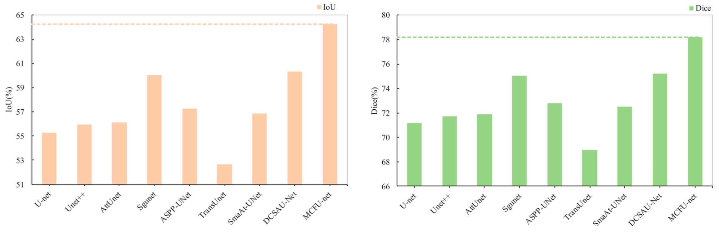 Figure 7. IoU and Dice metric histograms of the above models on the DDTI dataset: Dotted lines represent the metric values of MCFU-net (Ours).