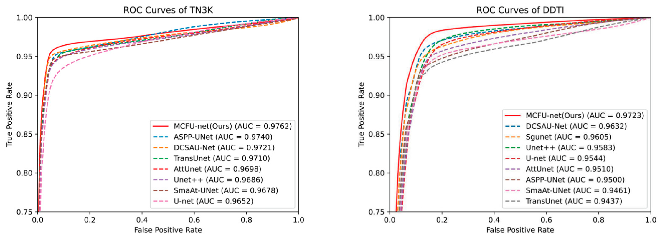 Figure 8. ROC curves of different algorithms on the TN3K and DDTI datasets.