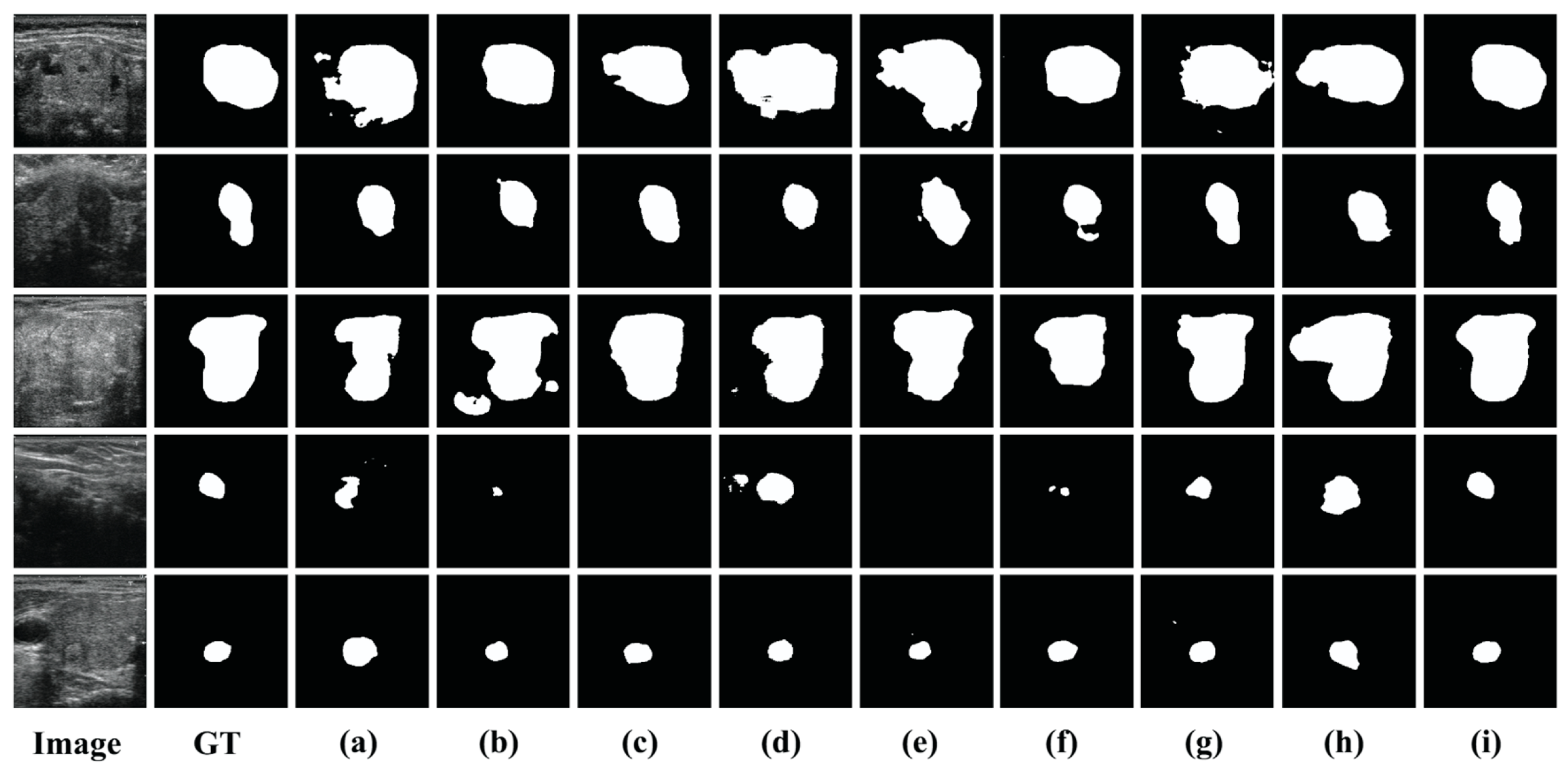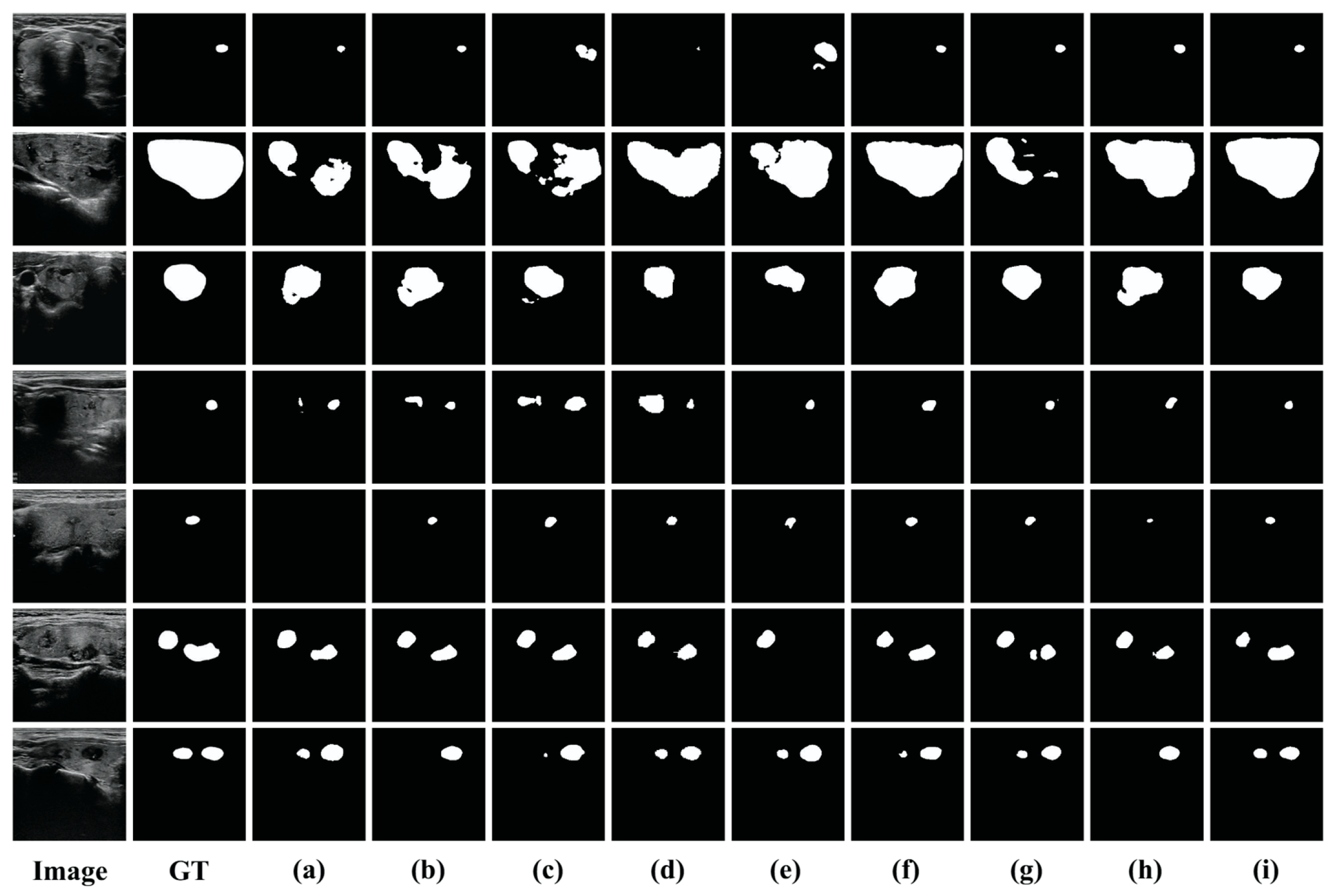Figure 10. Segmentation results of various methods on the DDTI dataset. (a) U-net; (b) Unet++; (c) AttUnet; (d) Sgunet; (e) ASPP-UNet; (f) TransUnet; (g) SmaAt-UNet; (h) DCSAU-Net; (i) MCFU-net.