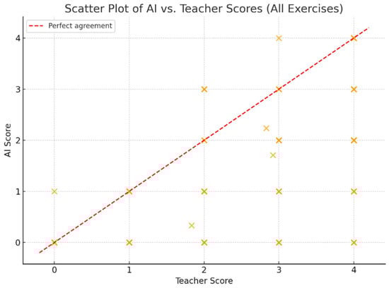 To visualize this relationship, a scatter plot (Figure 2) was created using all available individual scores from three exercises (E1, E5, and E9), with each point representing one student submission. The diagram illustrates how AI scores align with teacher scores, and includes a reference line denoting perfect agreement. A clear cluster of points below the diagonal line suggests a general tendency of the AI to underrate compared to human instructors.