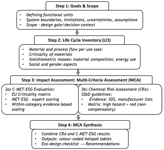 This section outlines the study’s design, data, and approach. Section 2.1 provides a brief overview of the five use cases. Section 2.2.1 presents the positioned approach, which involves a multi-criteria assessment that incorporates the step-by-step LCA ISO framework, detailing goals and scope. Section 2.2.2 describes the compilation of life-cycle inventory data from secondary sources and expert inputs. The impact assessment step (Section 2.2.3) comprises the C-MET-ESG hotspot analysis, the chemical risk assessment, and the MCA synthesis in relation to the eco-design checklist.