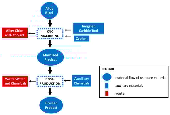 Material and product flow for conventional production (CNC), applicable to all use cases. It outlines the main steps of this production route, including all input and output materials.