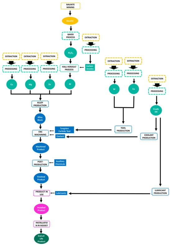 Detailed process tree for CNC-machined use cases, including upstream processes and relevant auxiliary materials, as well as downstream steps.