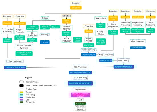 The product life cycle begins with the extraction of raw minerals for the primary CoCrMo alloy block, namely chromite, molybdenite, and carrollite, along with kaolin clay for the ceramic slurry and crude oil to produce investment casting wax. Additional mining is required for wolframite and carrollite to produce tungsten–carbide cutting tools. Crude oil is also needed for mineral oils (coolant) and for carbon black used in tungsten-carbide powder. Manufacturing of the knee implant begins with the creation of wax patterns, traditionally made using metal dies of aluminium, steel, duralumin, or brass. For this study, aluminium dies are assumed. The dies form the wax models, which are assembled and encased in a ceramic slurry to produce the mould. The wax is subsequently melted out, potentially recovered for reuse, and replaced with molten CoCrMo alloy during the investment casting stage. After solidification, the ceramic mould is broken away and discarded, revealing the femoral component. It exhibits antimicrobial properties, promotes cell adhesion, features low friction, and has a roughened surface to adhere to polymethylmethacrylate (PMMA) medical cement, facilitating osseointegration.