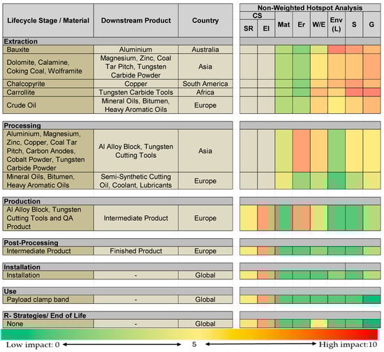 Figure 6 shows the simplified results of the C-MET-ESG analysis for the clamp band. The assessment covers Cradle-to-Grave. This excludes end-of-life (EoL) treatment processes, as clamp bands are non-recoverable due to launcher dissipation after missions. The non-weighted hotspot analysis identifies geographic regions for the processing stage of cobalt and copper as having the highest material use impacts. In these regions, chemicals, such as sulfuric acid, hydrogen sulfide, ammonia, and hydrochloric acid, are extensively used [27]. Copper processing additionally requires acids such as sulfuric acid. At the extraction stage, primary materials used include water and flotation additives. CNC machining of components during the production stage is also highly energy intensive, requiring a reported 144 kW for 85 h, 10 times per year, a total of 3326 MJ/kg [27].