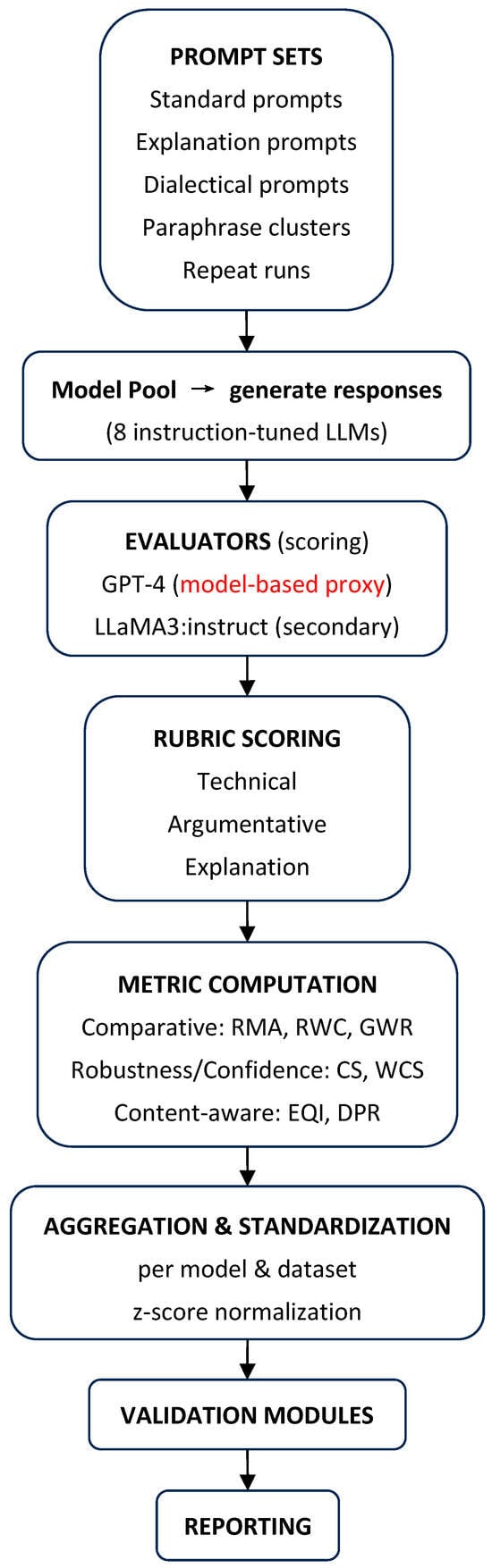 Despite their extensive adoption, LLMs present notable evaluation challenges, particularly in open-ended or generative contexts where accuracy is nuanced, outputs are inherently diverse, and users require comprehensive explanations, not merely answers [10,11]. As reliance on LLMs for instructional purposes and decision support grows, evaluation methodologies must evolve to accurately assess essential attributes including interpretability, argumentative quality, robustness to input variations, and pedagogical utility—areas inadequately covered by traditional evaluation techniques [11,12,13].