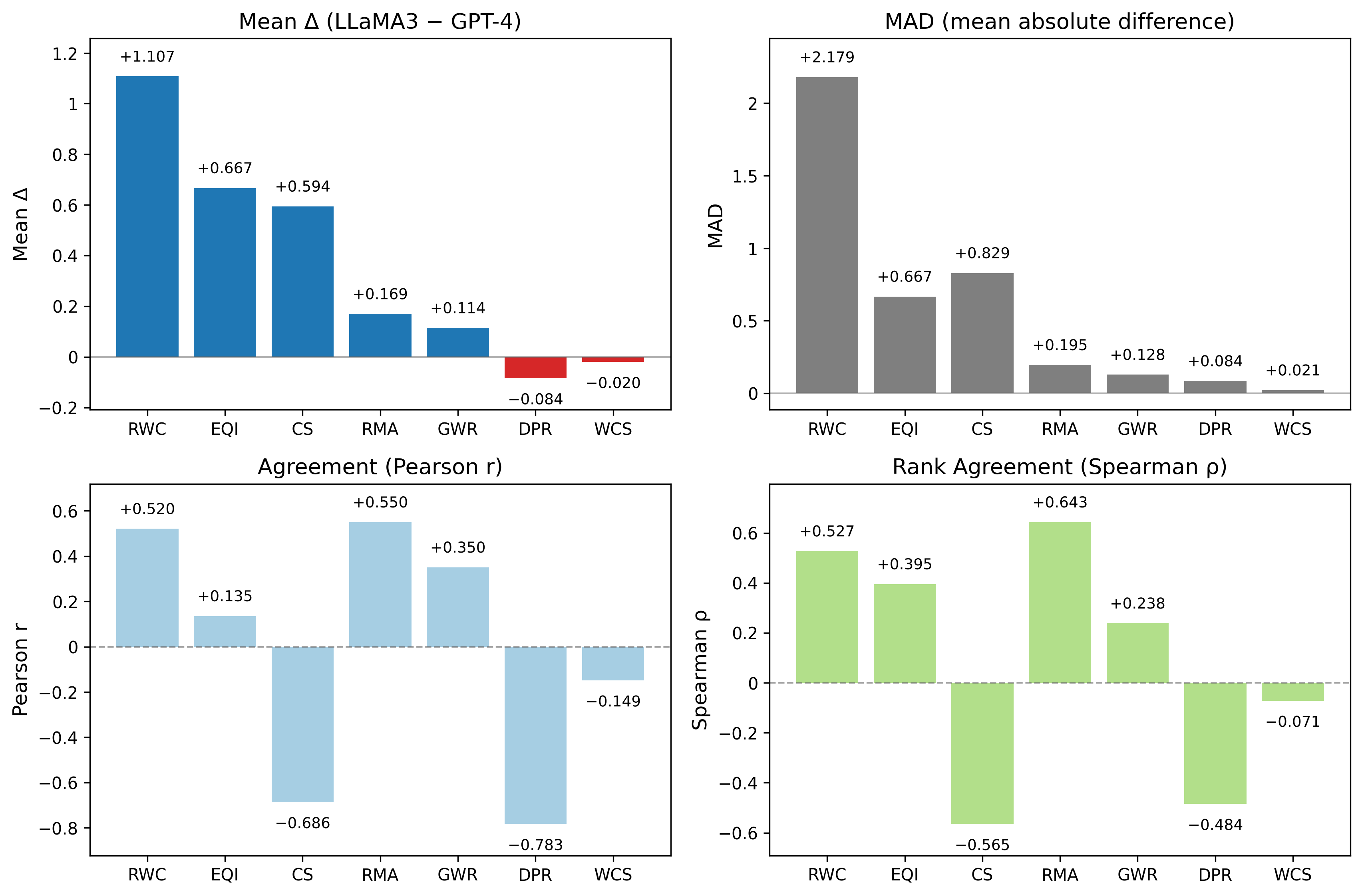 Metric | Mean Δ | MAD | % LLaMA3 Higher | % LLaMA3 Lower | Pearson r | Spearman ρ | Sign Test p |