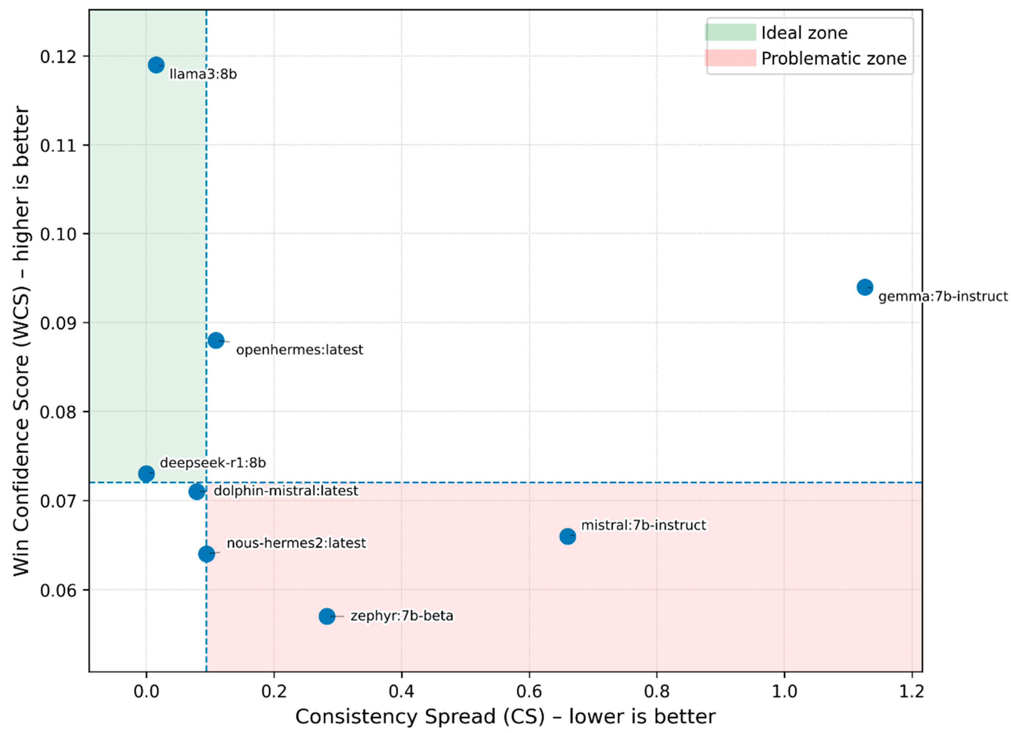 - Robustness and confidence metrics include the Consistency Spread (CS) and Win Confidence Score (WCS). These metrics assess model stability under prompt variation and the certainty of comparative outcomes.