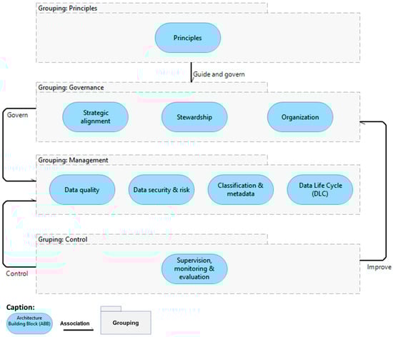 Even though we have found references that address DG in the context of DS, the documentation analyzed does not provide guidance on how to develop the necessary structure for its implementation. To address this gap, we propose the TRENTI DG framework [18,19,20], whose aim is to solve the “translation problem”: how to transform data strategies and high-level governance principles into tangible architectural components that can be designed, deployed, and maintained within a DS. The TRENTI framework was conceived precisely to address this gap. TRENTI is not merely a catalog of governance principles or procedures; it is a reference architecture that connects governance requirements with the enterprise architecture design through a modular and adaptable structure. The core contribution of this paper is the adaptation of TRENTI’s Architecture Building Blocks (ABBs) to support the implementation of DG in DSs, based on newly identified requirements specific to this context. In particular, the following ABBs have been adapted: principles, organization, roles and responsibilities, data quality, security and metadata management, and the data lifecycle. For ease of understanding, several ABBs related to DS are instantiated. These ABBs have been chosen based on considerations and documentation from the organizations involved in European DSs initiatives.