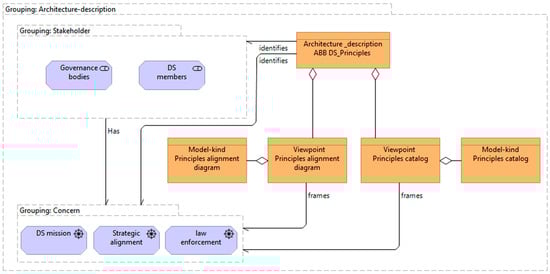 As shown in Figure 5, the architecture-description class in ABB DS_Principles is composed of the viewpoints: principles catalog and diagram of alignment of the principles with the goals and objectives of the DS.