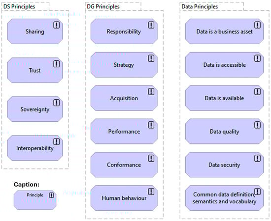 The DG system includes three groups of principles: (i) DS principles, (ii) DG principles and (iii) data principles. All of them are collected in Figure 6, where the DG principles are general principles established from the ISO/IEC 38505-1 standard [52].