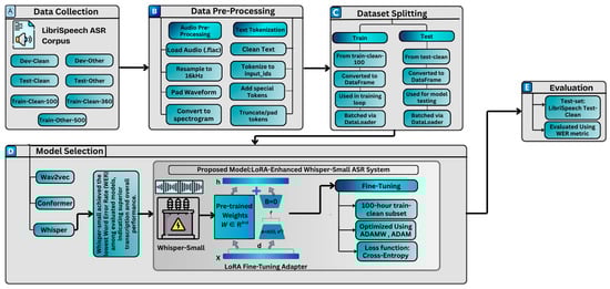 The data pre-processing stage involves a two-sided synchronized workflow in which one pipeline was for the audio pre-processing, while the second was geared toward text tokenization. In addition, the audio stream was pre-processed by loading the ‘.flac’ file into the model. Additionally, in order to handle audio of different lengths in a batch, dynamic padding was used, where each waveform was padded to have the same duration as the longest sample in the batch. The padded waveforms were subsequently fed into Log-Mel spectrogram conversion with the Whisper feature extractor so that the model could decode the acoustic signal in an appropriate format for transformer-based models. Moreover, the respective textual transcripts were normalized by reducing all characters to lowercase, removing punctuation, and reducing textual variation. The cleaned text was tokenized with Whisper’s tokenizer, which converted the cleaned sentences into numerical token IDs. The padding and truncation were also performed as necessary, and special tokens were inserted to mark the start and end of each sequence. However, the pre-processing was performed in two parallel paths, which dealt with two different streams of data output, which were ready to feed into the chosen models for a consistent process.