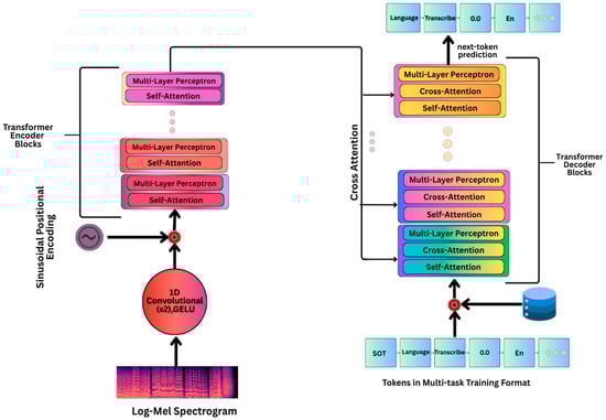 Whisper architecture is based on a transformer encoder-decoder design that breaks the input audio into 30 s chunks and turns into Log-Mel spectrograms in the form of features. The overlapping chunks are made to keep things consistent while processing longer sentences. Subsequently, while going through positional encodings and convolutional layers, the transformer encoder achieves higher-level contextual and linguistic representations from the spectrogram features as shown in Figure 2. Furthermore, the decoder uses self-attention on the tokens and cross-attention on the encoded features to make transcriptions in an autoregressive way [9,10]. Table 1 provides the configuration details for various Whisper architectures used in this study.